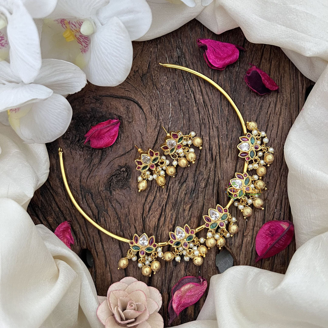 Elevate your elegance with the Vriksham Premium AD Stone Lotus Hasli, featuring a refined gold finish accented by vibrant red, green, and white stones. This exquisite necklace blends traditional artistry with contemporary design, making it a perfect statement piece for special occasions. Its intricate lotus motif symbolizes purity and grace, enhancing your sophisticated style effortlessly.