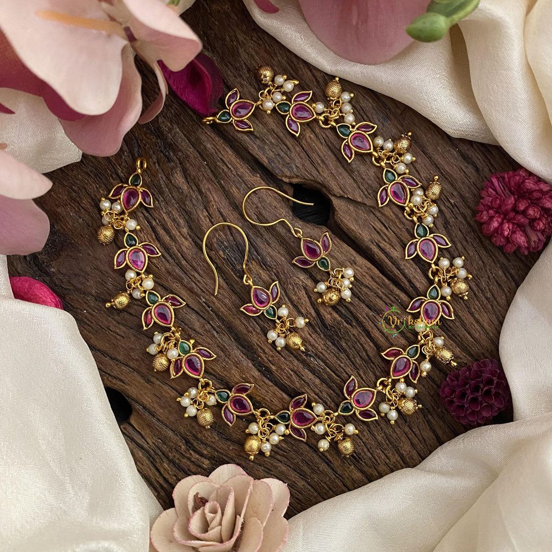 Premium AD Stone Lotus Short Neckpiece-Red Green ad stone AD stone studded Short Neckpiece and earring. Pearl and ghungroo Finish.