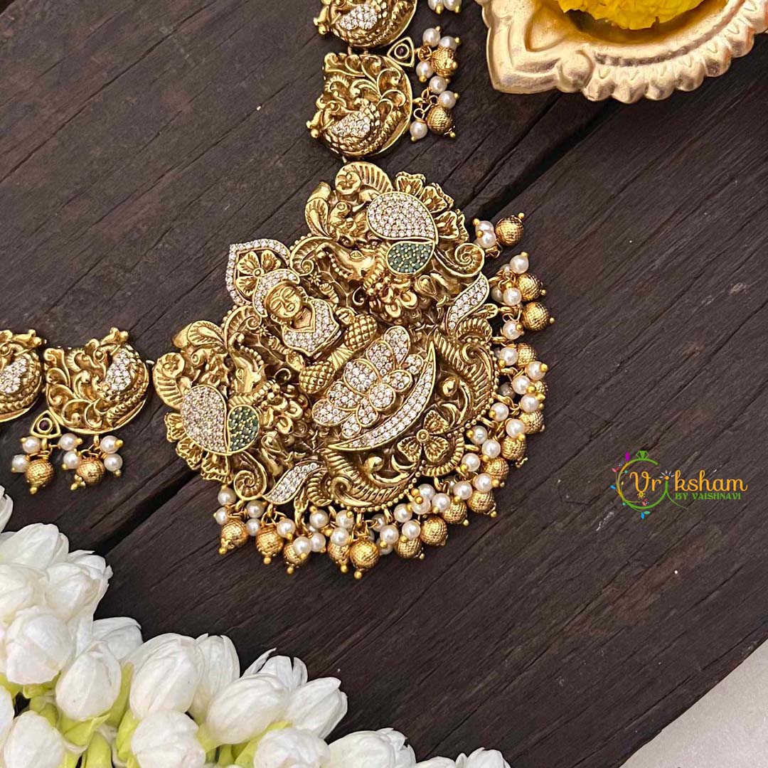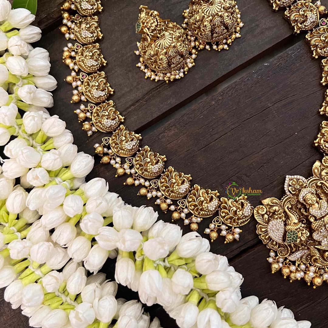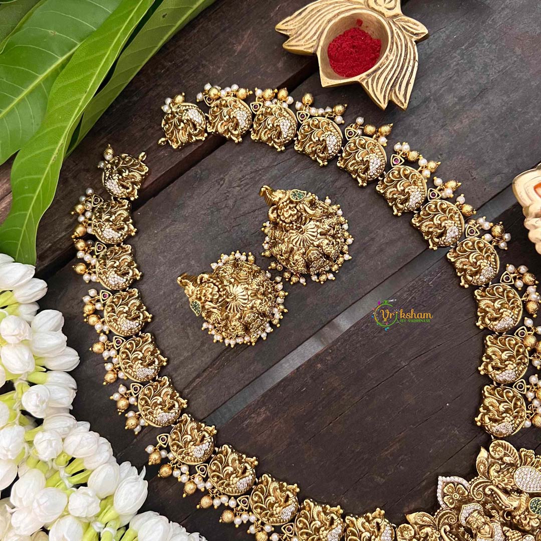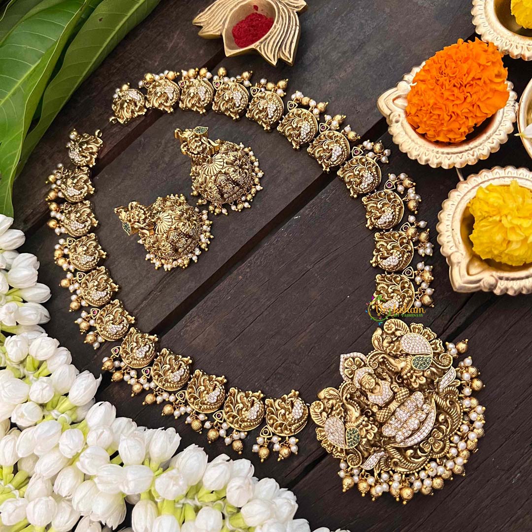 Premium AD Stone Pendant Lakshmi Haram – premium polish pearl finish temple jewelry with lakshmi peacock patterned neckpiece, comes with matching jhumkas.