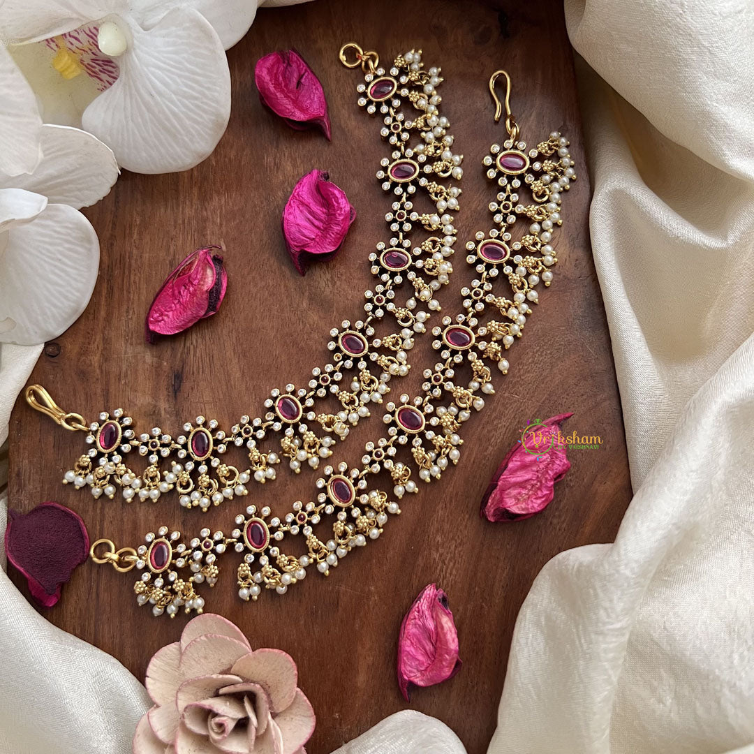 Elevate your elegance with the Vriksham Premium AD Stone Single Strand Maatil-Pearl in Red and Green. This exquisite piece combines lustrous pearls with finely crafted AD stones, creating a harmonious blend of traditional charm and refined style. Its vibrant red and green hues add a touch of regal sophistication, perfect for complementing both festive and formal attire. Ideal for those who appreciate timeless beauty with a contemporary edge.