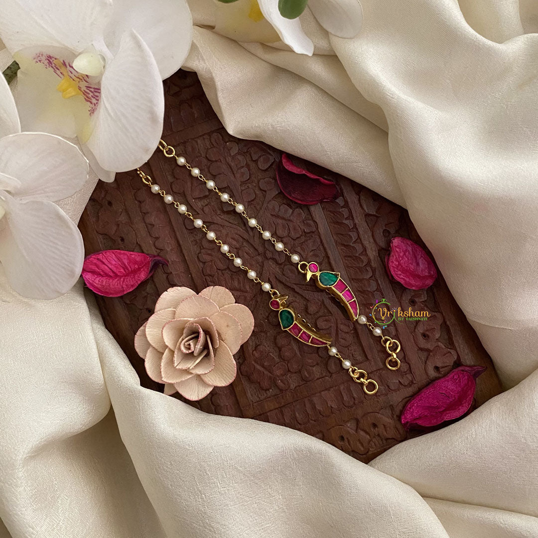 Introducing Vriksham's premium Maatil, adorned with a stunning bird-shaped red and green stone and a single strand of lustrous white pearls. This unique piece combines nature-inspired design with luxurious materials, making it the perfect accessory for the sophisticated and exclusive woman. Elevate any outfit with this elegant and tasteful Maatil.