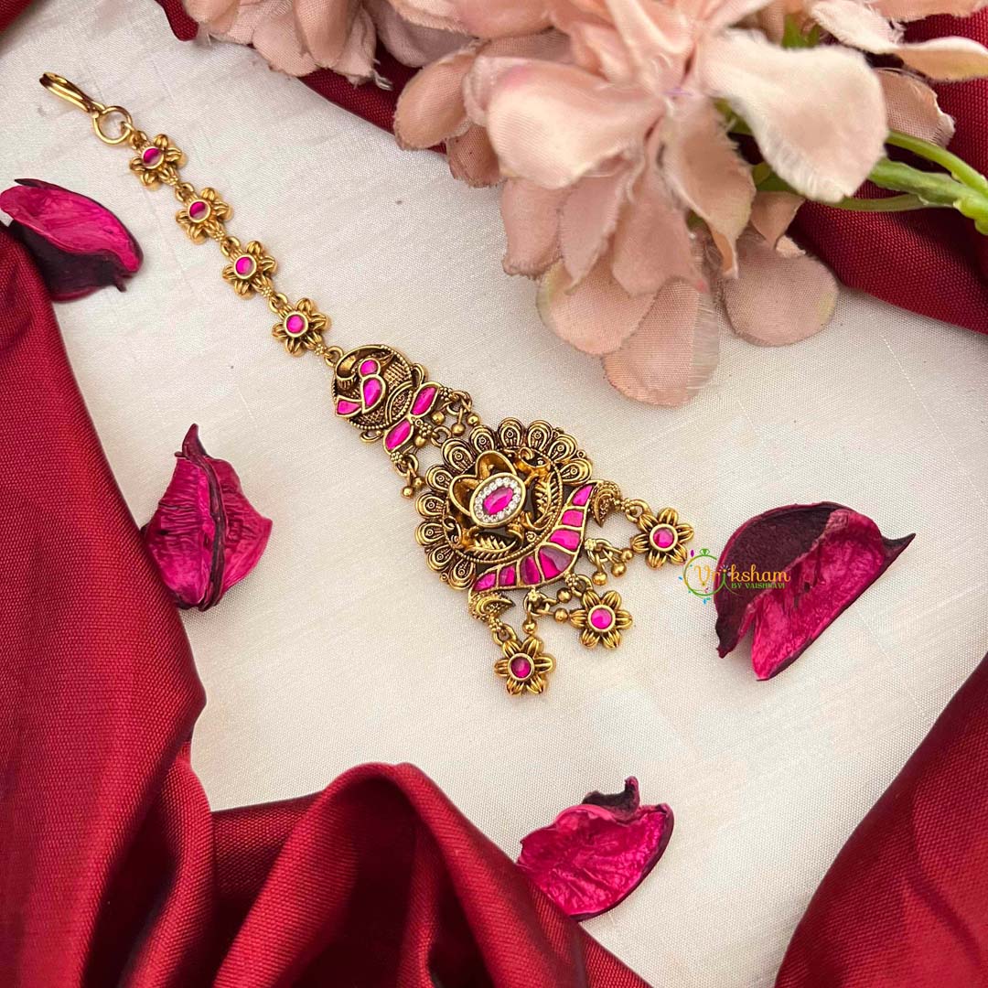 Command attention with this premium kundan jadau maang tikka, showcasing bold red gemstones that radiate regal splendor and timeless allure. The exquisite kundan craftsmanship is elevated by graceful floral drop details that introduce an element of refined elegance and botanical sophistication. This striking piece perfectly balances dramatic color intensity with delicate artistry, creating a maang tikka of unparalleled beauty. Ideal for brides who embrace bold statements while honoring classical traditions, this jewelry transcends mere adornment, serving as a powerful expression of cultural heritage, confidence, and enduring sophistication.