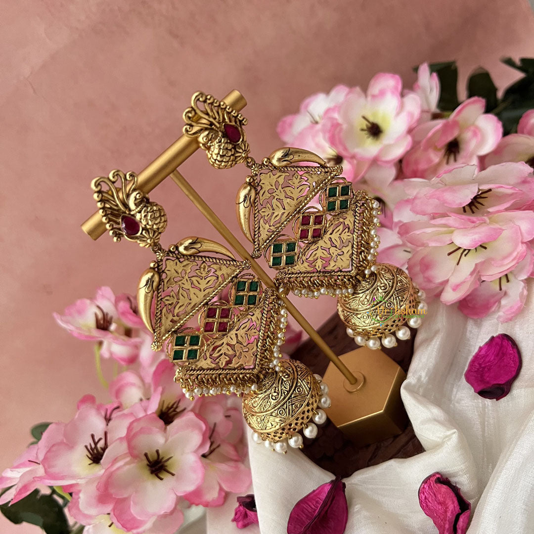 Artfully designed Round Jhumkas adorned with vibrant red green Maatil detailing. These sophisticated earrings showcase meticulous craftsmanship with their perfect circular form and rich crimson accents. The harmonious blend of traditional aesthetics and refined styling makes these jhumkas an exquisite addition to both heritage ensembles and contemporary attire.