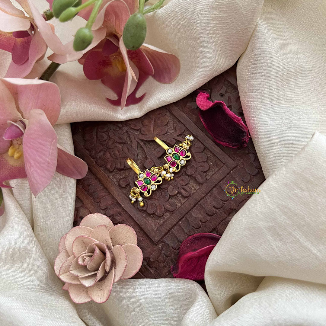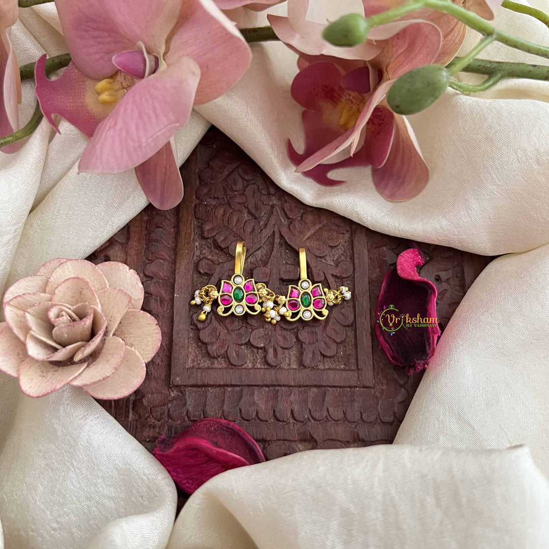 The Vriksham Premium Butterfly Kundan Jadau Press Bugadi captures elegance with its intricate butterfly design, beautifully set in red, white, and green tones. Accented with lustrous pearls and detailed Kundan work, this piece offers a refined touch to elevate classic ethnic ensembles.
