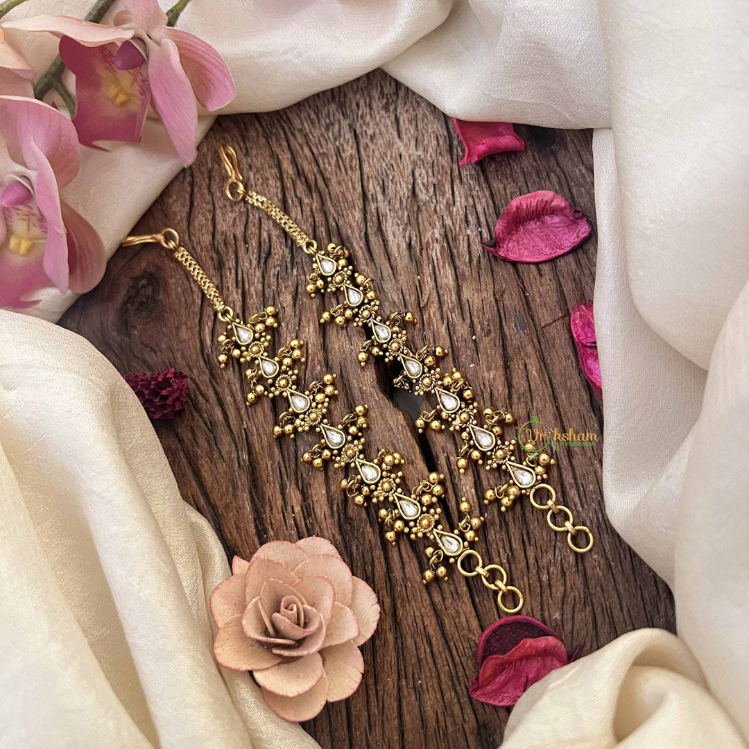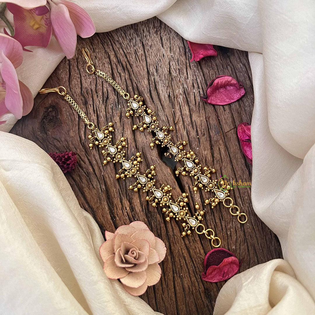Discover refined elegance with this premium maatil, featuring delicate floral motifs interspersed with lustrous pearl clusters. The pristine white pearls create a luminous quality that catches light beautifully, while the intricate floral design adds an artistic dimension to this traditional piece. Perfect for brides seeking understated grandeur or those who appreciate jewelry that balances ornate craftsmanship with graceful simplicity. This versatile maatil seamlessly transitions from festive celebrations to intimate gatherings, making it an essential addition to any discerning jewelry wardrobe.