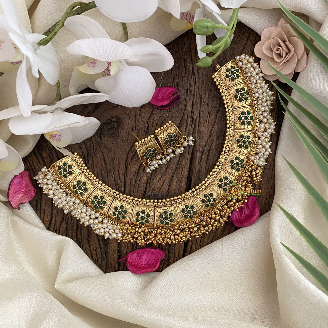 Indulge in luxury with the Vriksham Premium Cluster Pearl & Ghungroo Hasli Choker. This exquisite choker features a stunning combination of pearls and ghungroos, creating a unique and elegant look. Elevate any outfit with this exclusive piece that is sure to make a statement.