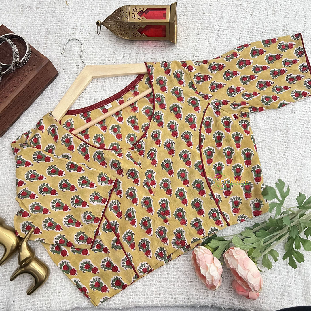 Colour: Yellow Printed Readymade 100% Jaipuri Cotton Blouse.