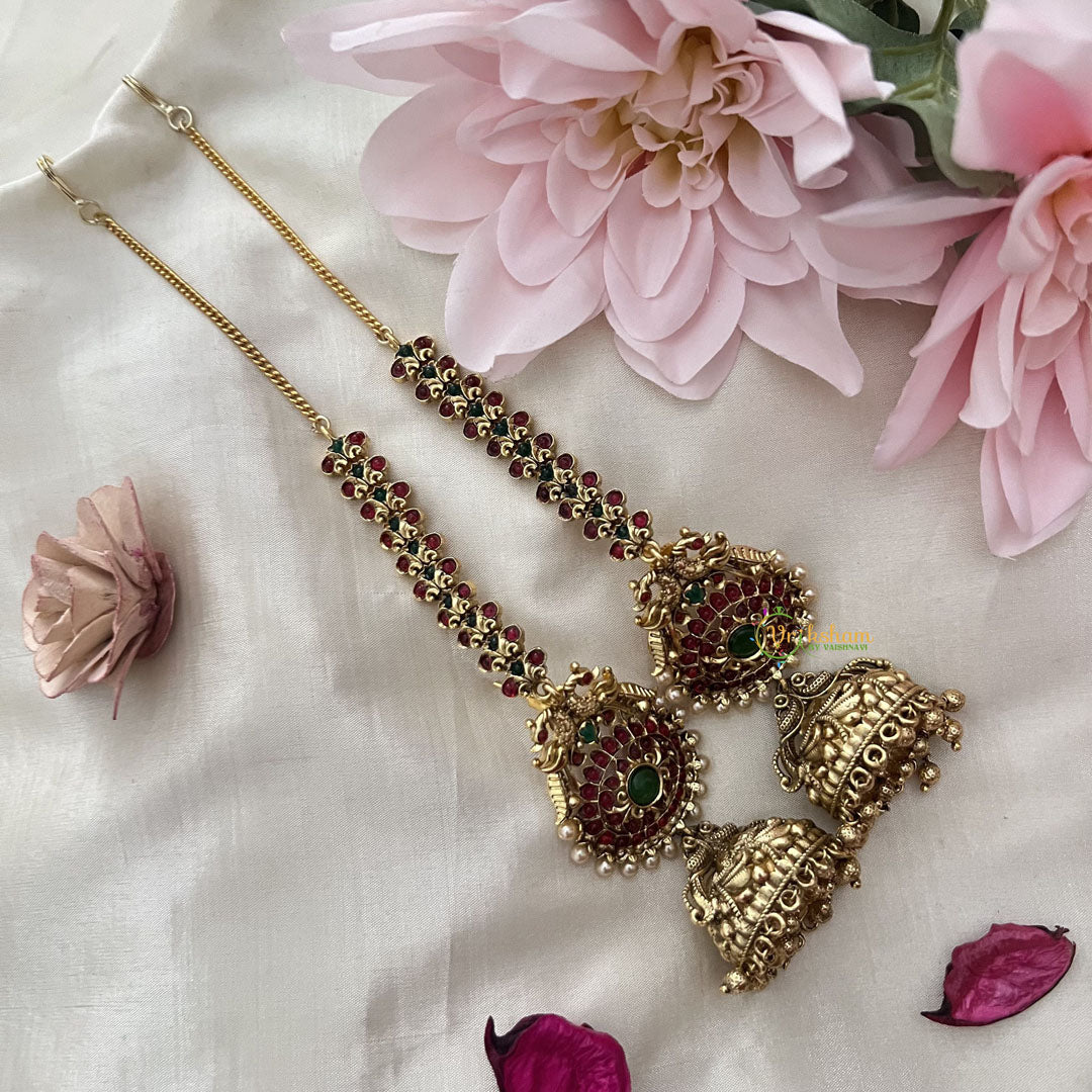 Premium Gold Look Alike Jhumkas-Pearls-Maatil- - The Premium Gold Look Alike Jhumkas follows the pattern of flower with dual peacock along with studded with non precious color stones on flower as well as on maatil and golden pearls finish to slay your pretty occasions.
