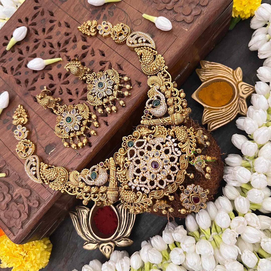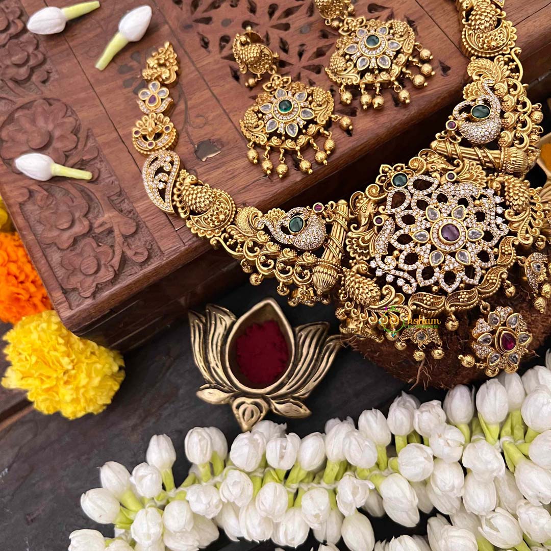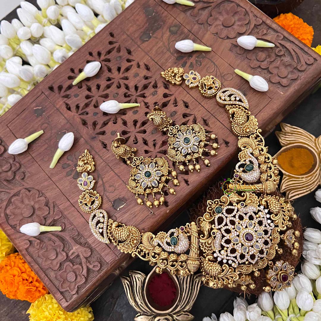 Experience refined opulence with this premium temple short neckpiece, where lush floral designs intertwine with graceful peacock feather elements. The lustrous gold-look finish paired with gleaming gold beads creates a luminous aesthetic that captures light beautifully. This piece exemplifies the marriage of botanical elegance and avian symbolism, both revered in Indian jewelry traditions. The intricate composition speaks to meticulous artisanal craftsmanship, making it an ideal choice for weddings, festive occasions, or spiritual ceremonies. A sophisticated adornment that celebrates nature's beauty while honoring timeless cultural artistry.