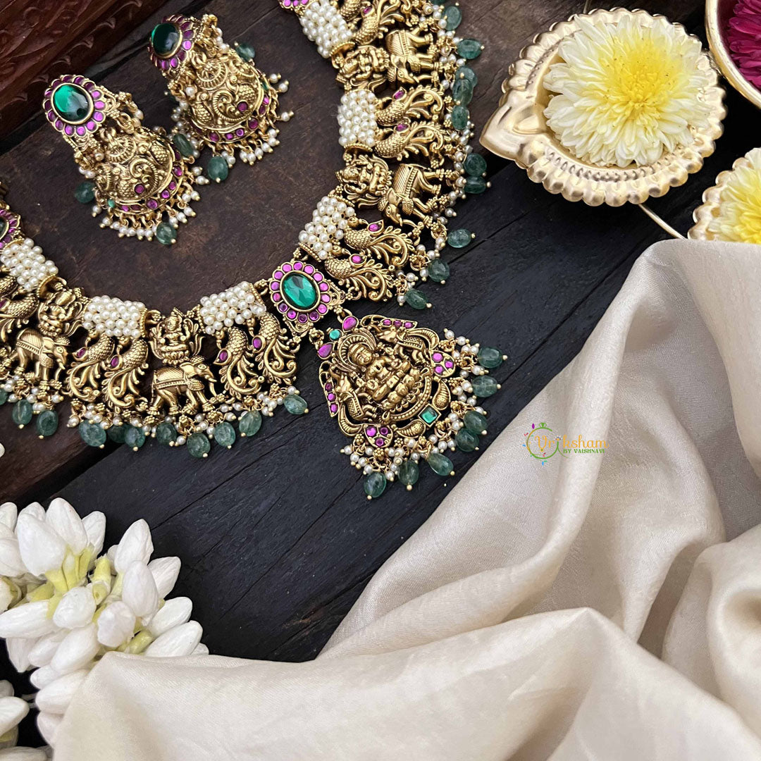 This premium gold-plated short neckpiece features a Lakshmi motif adorned with pearls and complemented by red and green accents, along with green beads. Its exquisite craftsmanship and elegant design make it a sophisticated accessory perfect for enhancing traditional and festive ensembles.