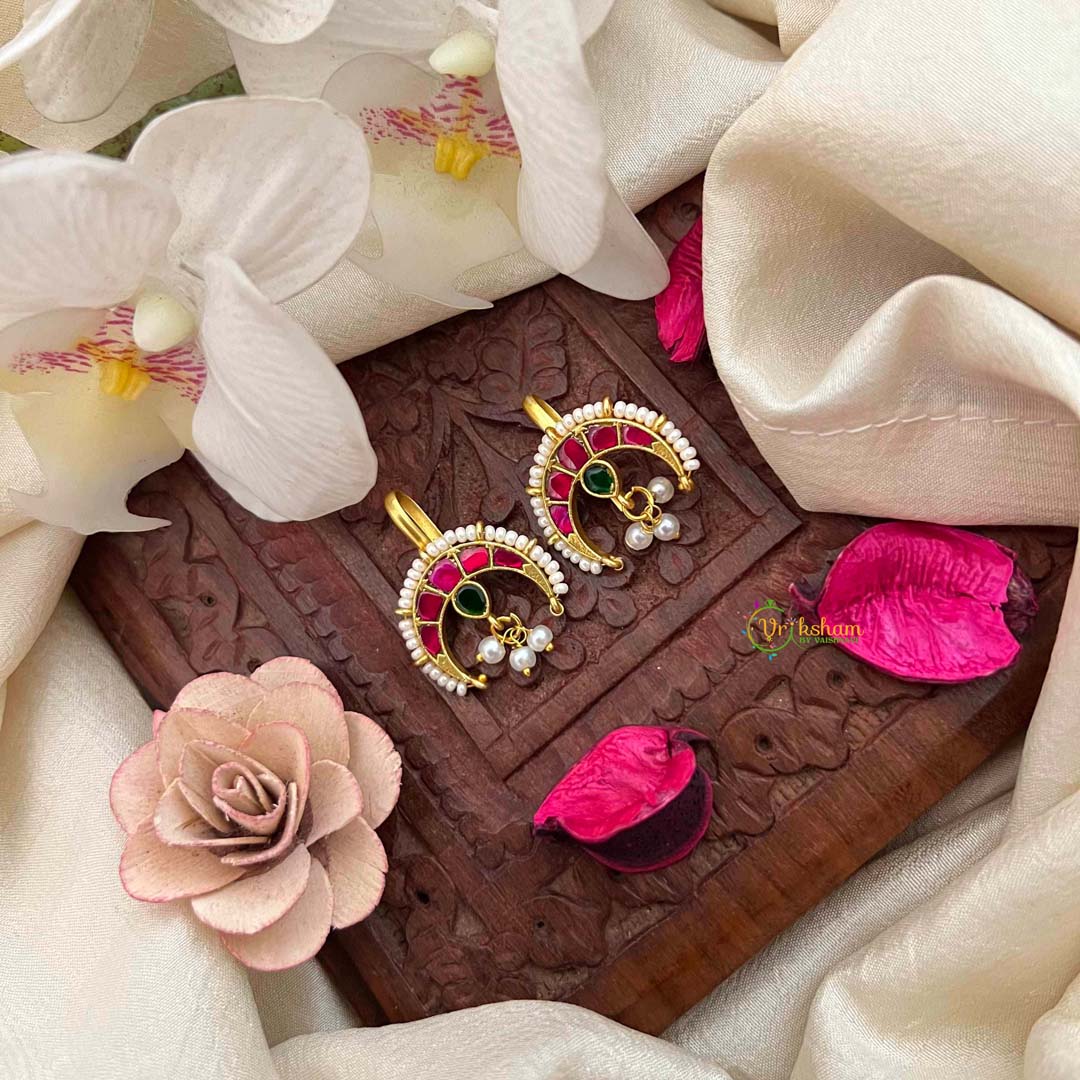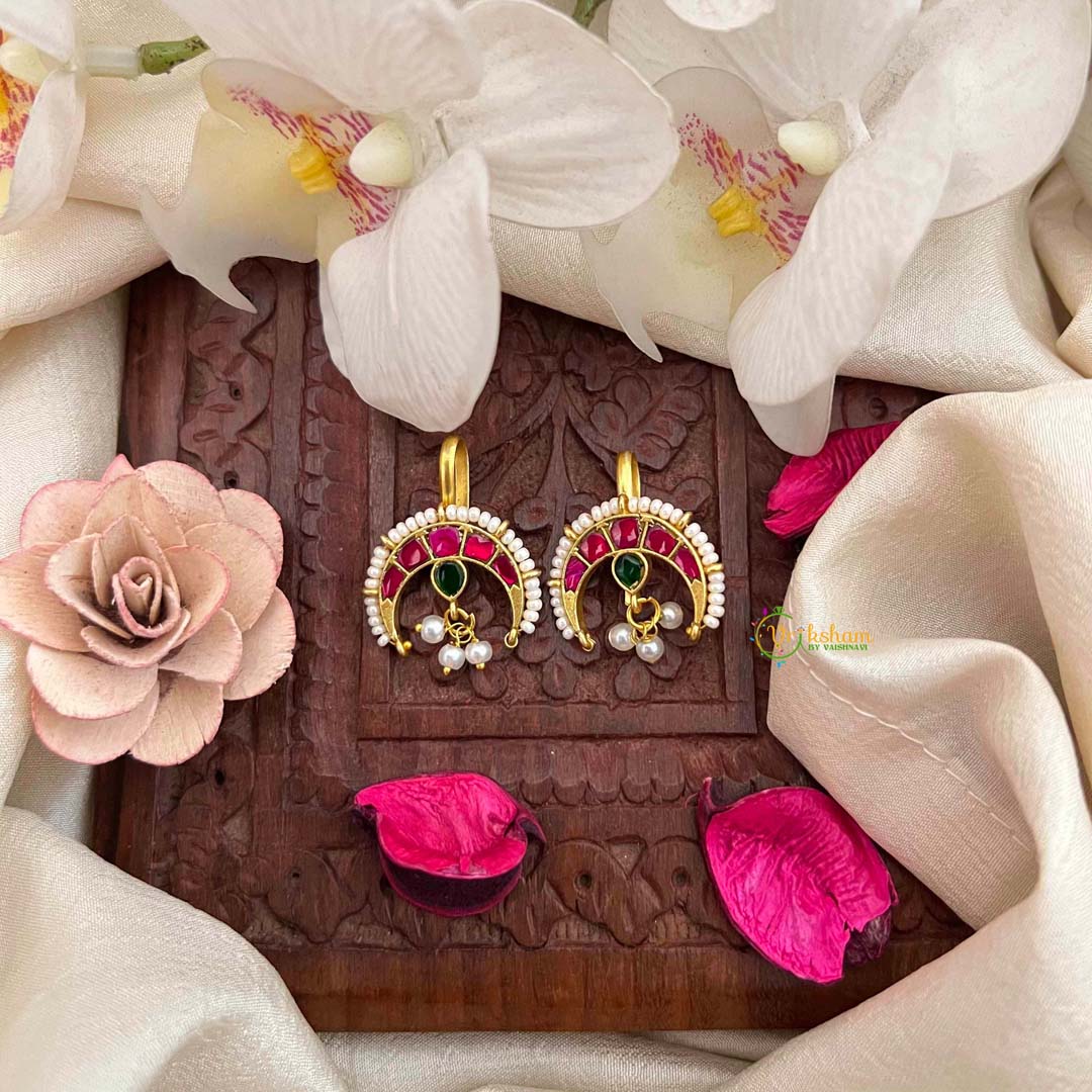 Elevate your bridal ensemble with this exquisite Kundan Jadau Bugadi, a masterpiece of traditional Indian craftsmanship. Featuring an enchanting half-moon and pear drop design, this piece showcases intricate kundan work paired with lustrous pearls in rich red and green hues. Each stone is meticulously hand-set using the ancient jadau technique, ensuring unparalleled brilliance and durability. The sophisticated color palette complements both traditional and contemporary wedding attire, making it an investment piece for generations. Perfect for those who appreciate timeless elegance and authentic artisanal jewelry.