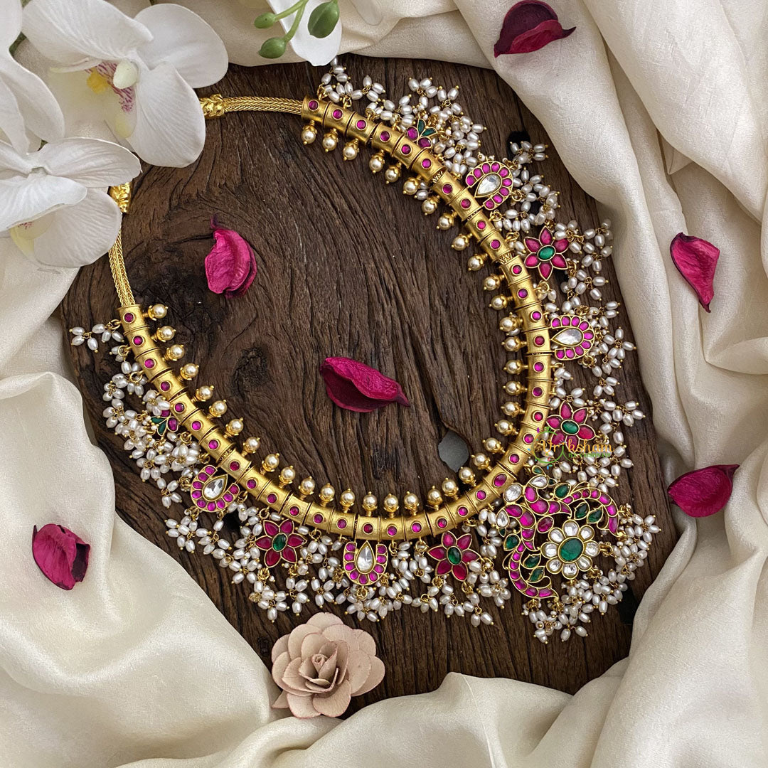 Indulge in the ultimate luxury with our Vriksham Premium Jadau Kundan Guttapusalu Neckpiece. Handcrafted with intricate details, this neckpiece is a true masterpiece that exudes elegance and sophistication. Elevate your look and make a statement with this exclusive piece that is sure to turn heads.