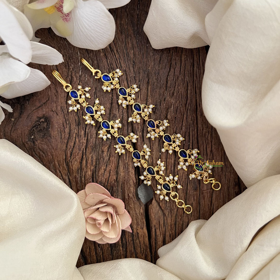 Indulge in the luxurious and exclusive Vriksham Kemp Single Strand Maatil, adorned with lustrous white pearls and vibrant blue accents. Elevate your look with this sophisticated piece, a perfect fusion of elegance and tradition. A must-have for any fashion-forward individual.