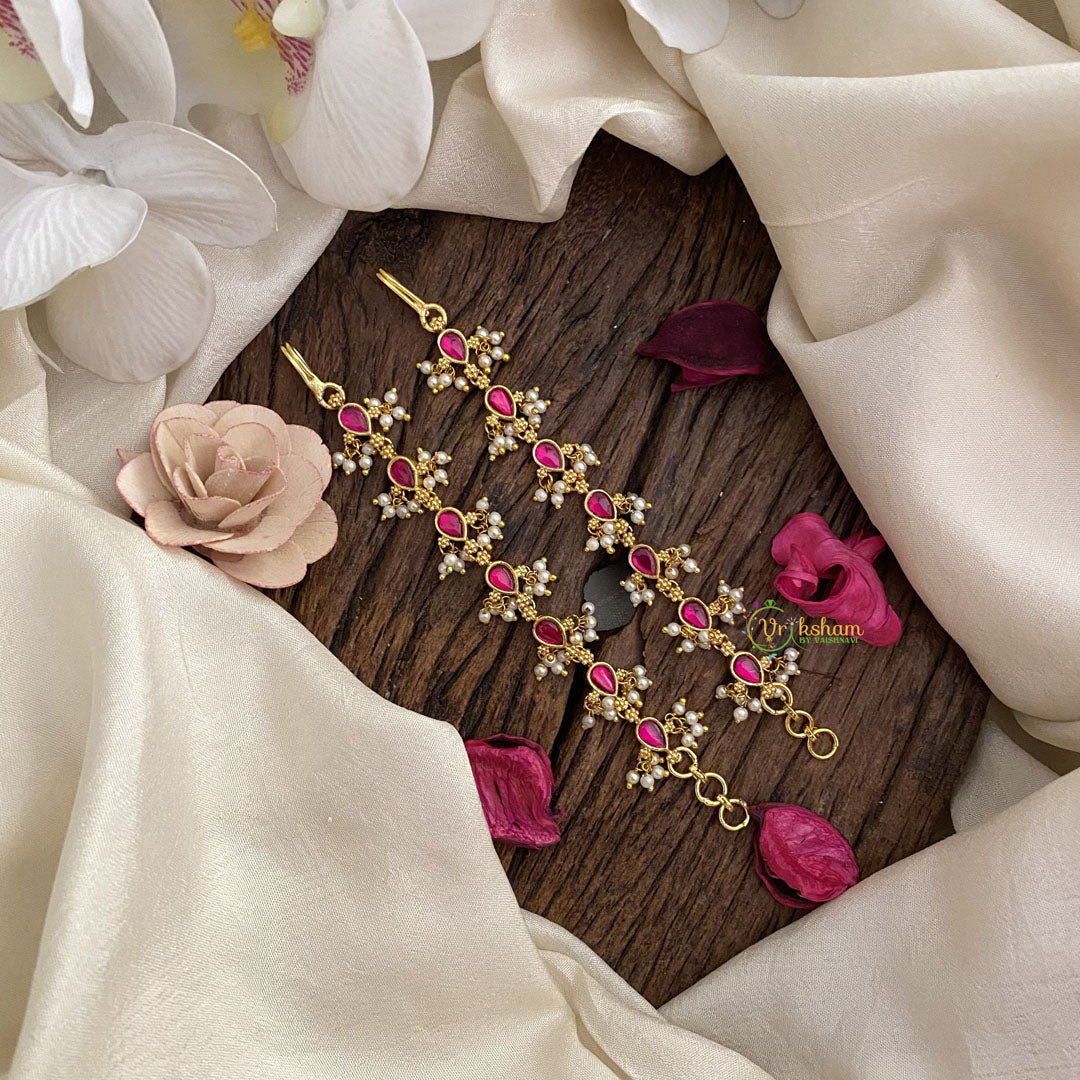 Indulge in the luxurious and exclusive Vriksham Kemp Single Strand Maatil, adorned with lustrous white pearls and vibrant pink accents. Elevate your look with this sophisticated piece, a perfect fusion of elegance and tradition. A must-have for any fashion-forward individual.