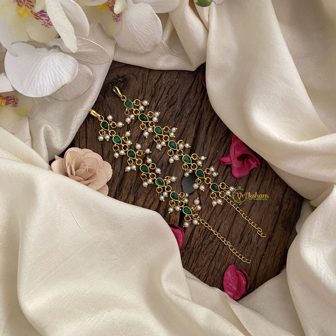 Elevate your look with our Vriksham Premium Kemp Stone Single Strand Maatil. Adorned with a captivating white pearl and fiery green Kemp stones, this necklace is a statement piece that exudes luxury and sophistication. Handcrafted to perfection, it is the perfect addition to your jewelry collection.