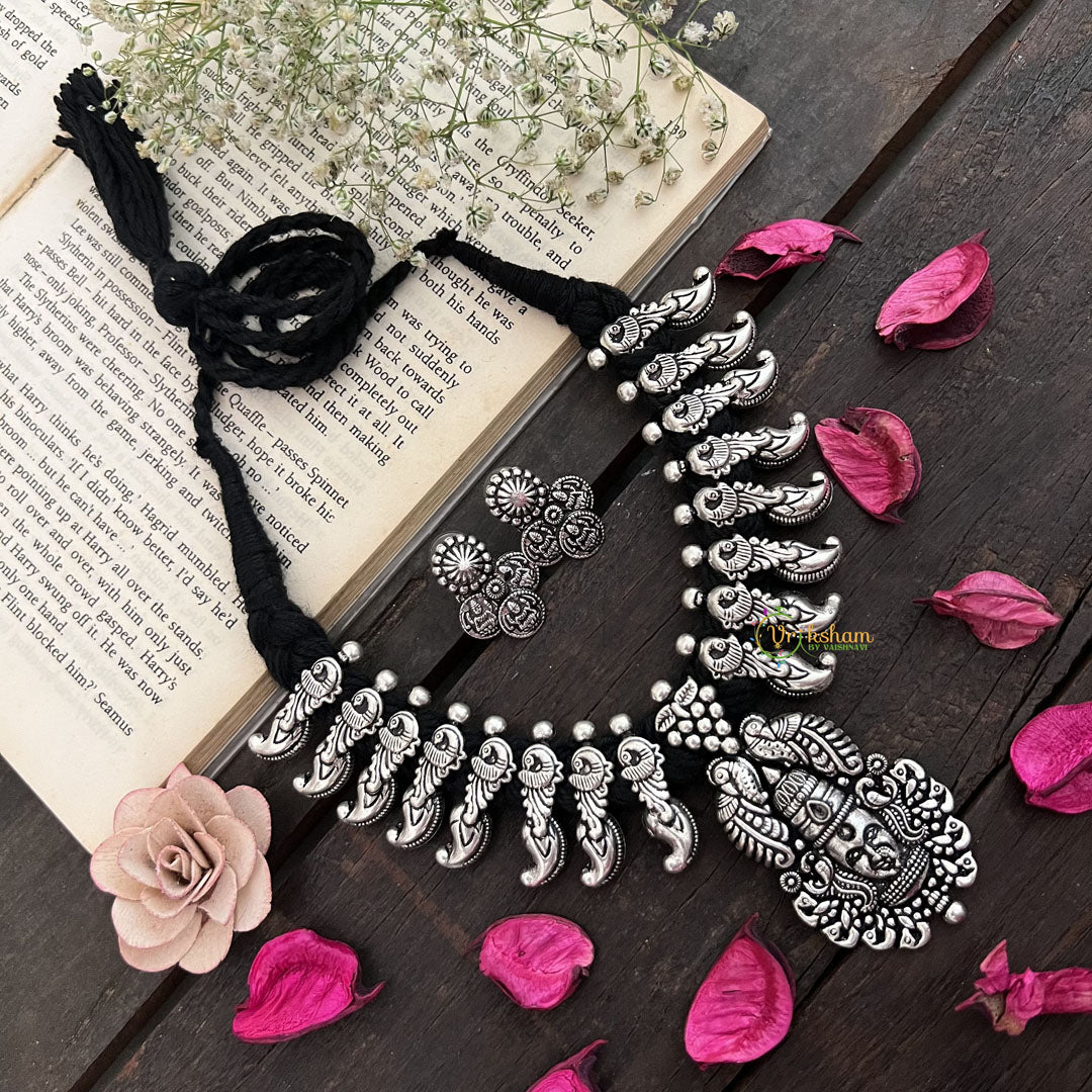 The Vriksham Premium Kolhapuri Balaji Neckpiece features a finely crafted oxidized silver Balaji pendant paired with a sleek black thread. This sophisticated design combines traditional Kolhapuri artistry with contemporary elegance, making it a distinguished accessory to complement your ethnic collection.