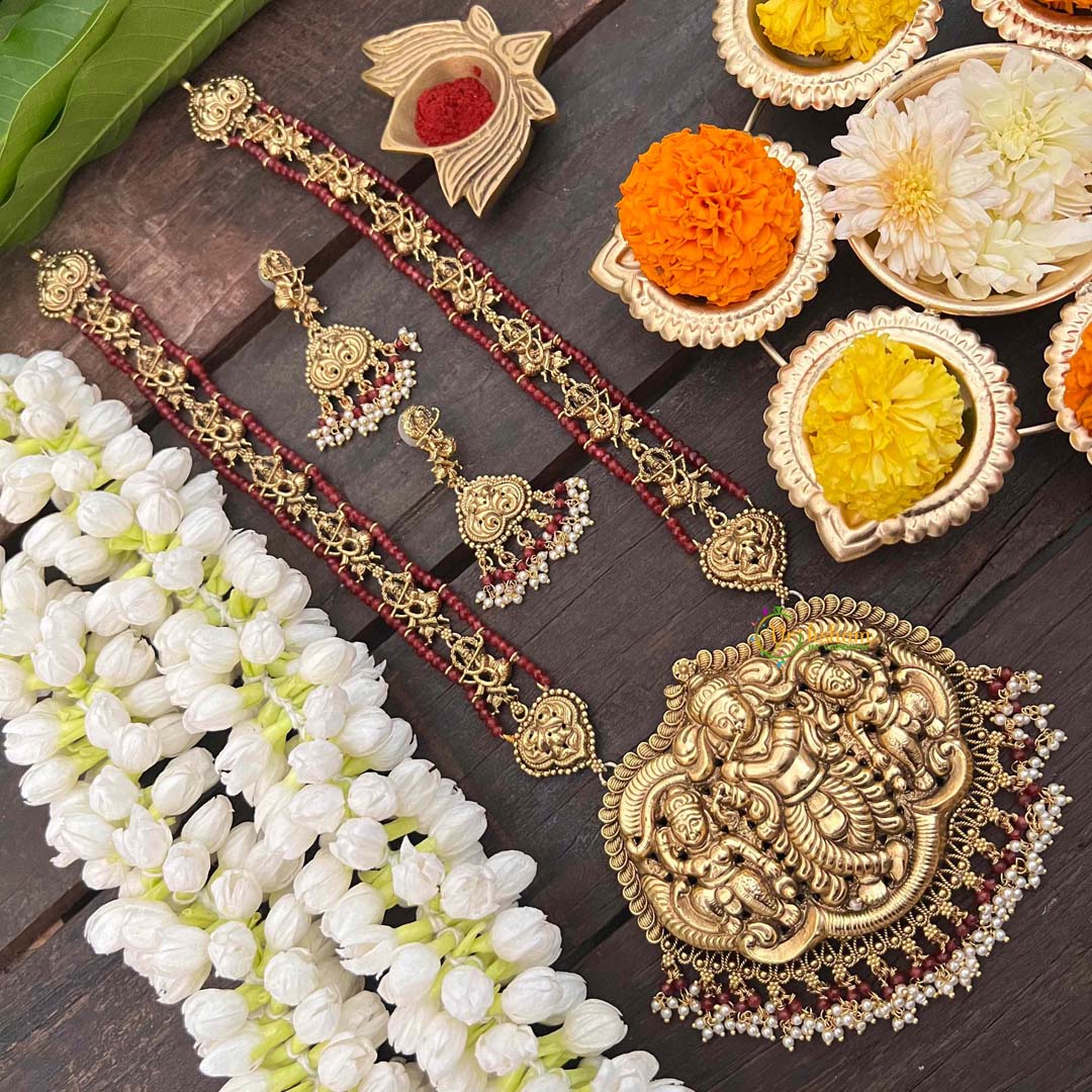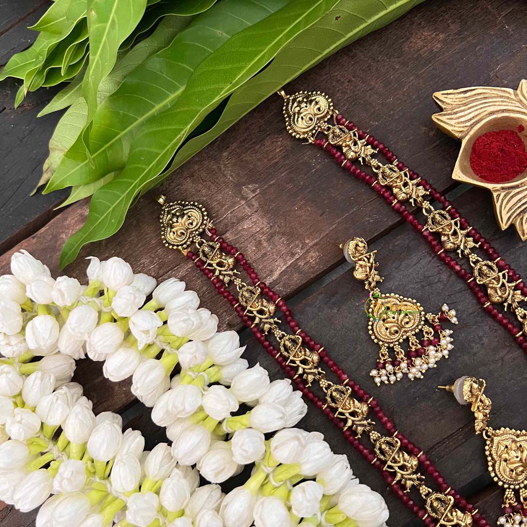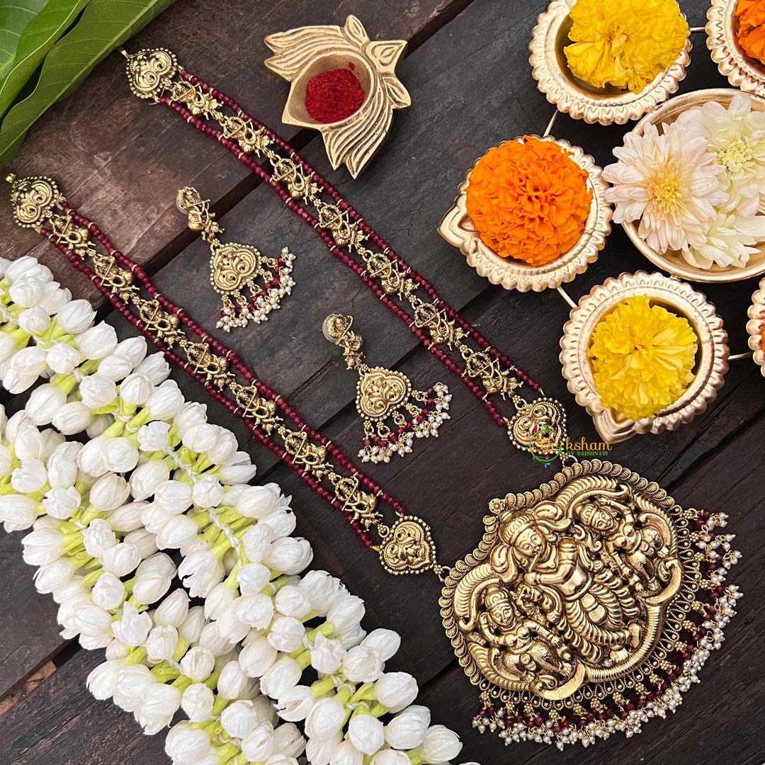 Indulge yourself in the ultimate luxury with our Premium Krishna with Gopikas Pendant Layered Haram. The intricate maroon bead design adds a touch of elegance while the matching earrings complete the set. This exclusive pendant brings the divine love of Krishna and his Gopikas to life, making it a must-have for any sophisticated and tasteful wardrobe.