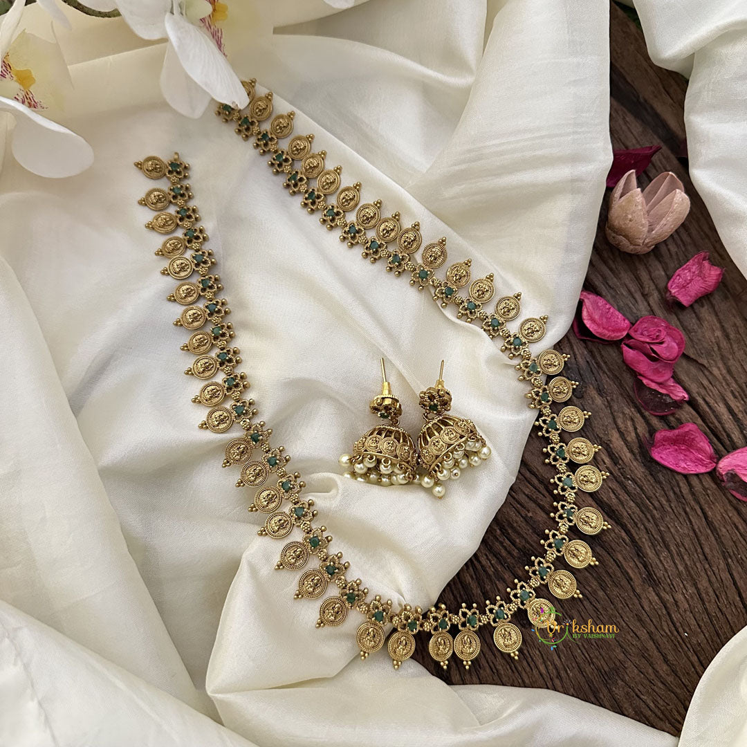 Indulge in luxury with our Vriksham Premium Lakshmi Coin Kaasu Mala in green. Adorned with intricate coin details, this necklace exudes elegance and sophistication. Channel the goddess of prosperity, Lakshmi, as you don this exclusive piece. Elevate your spiritual and style game with this premium mala.