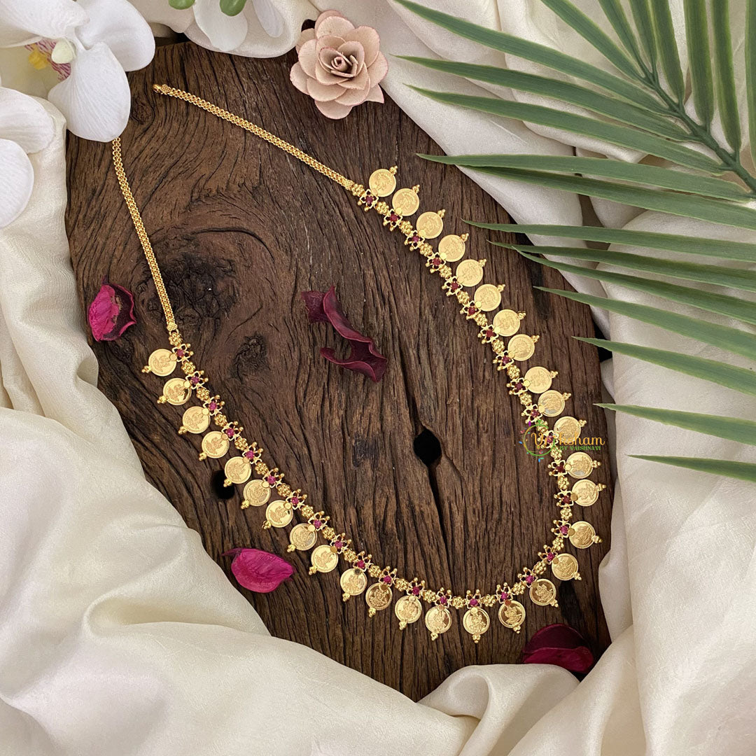 Indulge in opulence with our Vriksham Premium Lakshmi Coin Kaasu Mala Mid Length Neckpiece. Handcrafted to perfection, this elegant piece features stunning Lakshmi coins on a classic kaasu mala design. Perfect for any occasion, it adds a touch of luxury and sophistication to any outfit. Elevate your style with this exclusive piece.