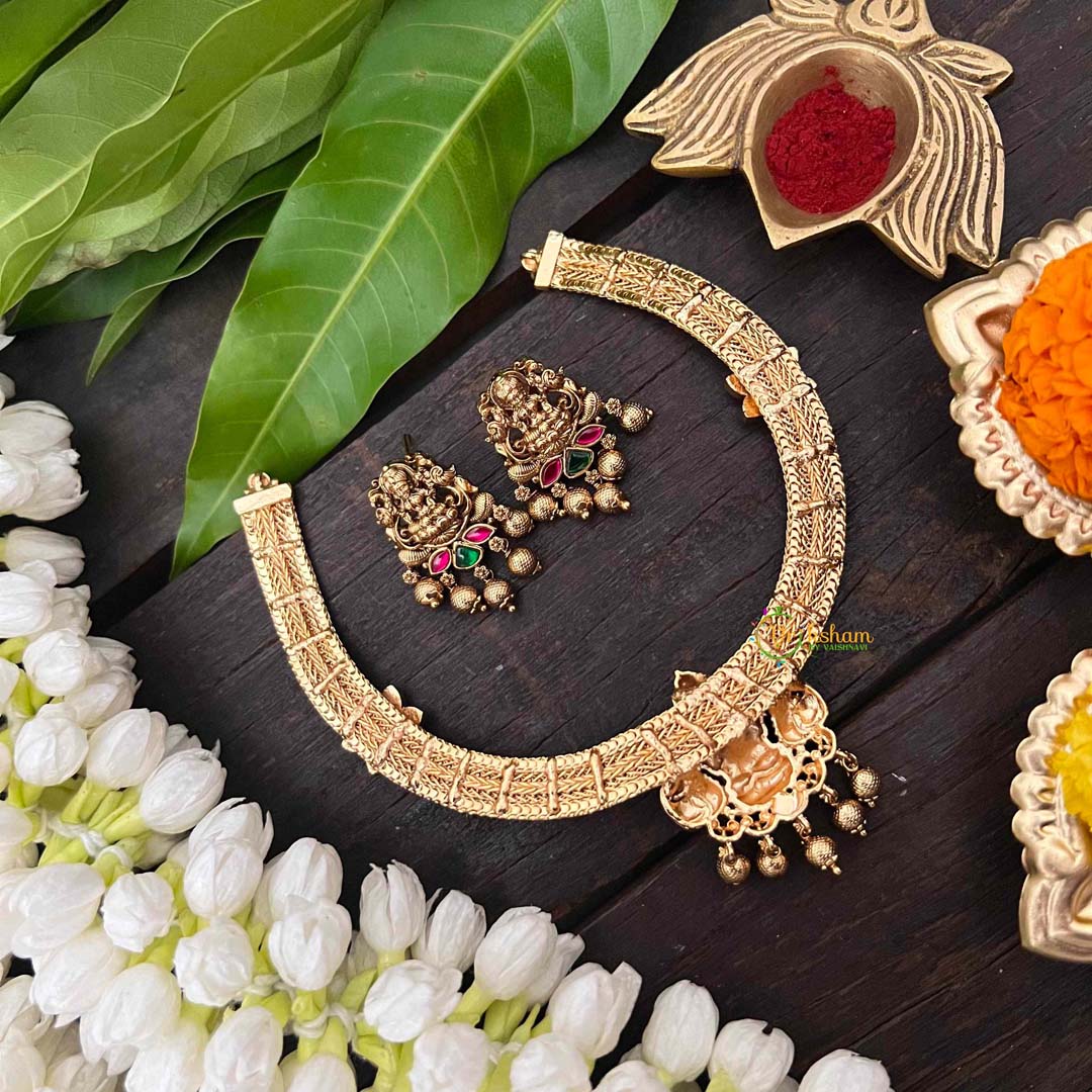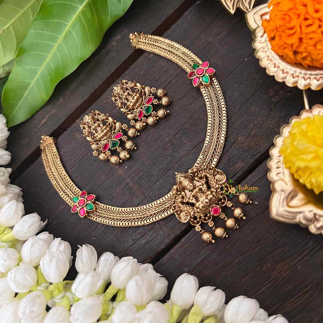 Discover refined elegance with this gold-plated AD floral coin short neckpiece, a jewel that celebrates vibrant tradition. Adorned with intricately carved floral coins and embellished with sparkling AD stones in captivating red, white, and green tones, this piece radiates festive sophistication. The premium gold plating ensures lasting lustre and durability, while the short length offers comfortable, versatile styling for various occasions. Each floral detail is meticulously crafted to showcase authentic artisanal excellence, making this neckpiece a standout accessory for celebrations, weddings, and cultural events. Whether paired with traditional attire or contemporary ensembles, this jewelry piece brings an air of refined grace and timeless beauty to any wardrobe.