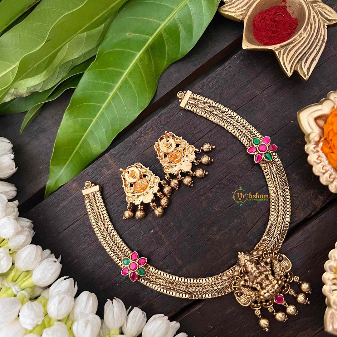 Enhance your traditional attire with our Vriksham Premium Lakshmi Dual Peacock Jadau Addigai. Featuring intricate handcrafted details and vibrant red and green colors, this piece adds a touch of elegance and luxury to any outfit. The gold beads and dual peacock design represent beauty, grace, and prosperity. Elevate your style with this premium accessory.