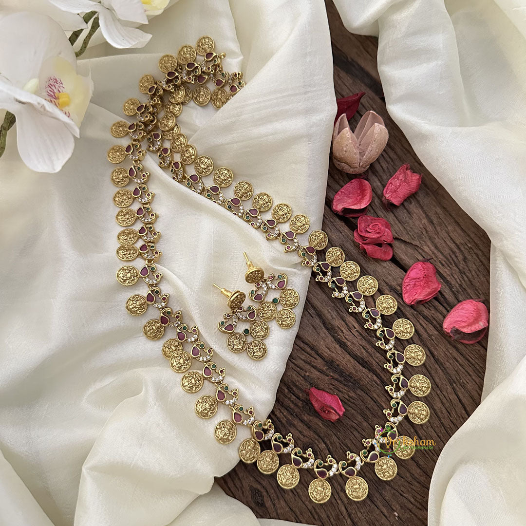 Introducing the Vriksham Premium Lakshmi Kaasumala Long Neckpiece in stunning Red and Green. Made with top-quality materials, this neckpiece exudes luxury and sophistication. Adorned with intricate Lakshmi designs, it is a must-have for any fashion-forward individual looking to make a statement. Elevate your style with this exclusive piece.