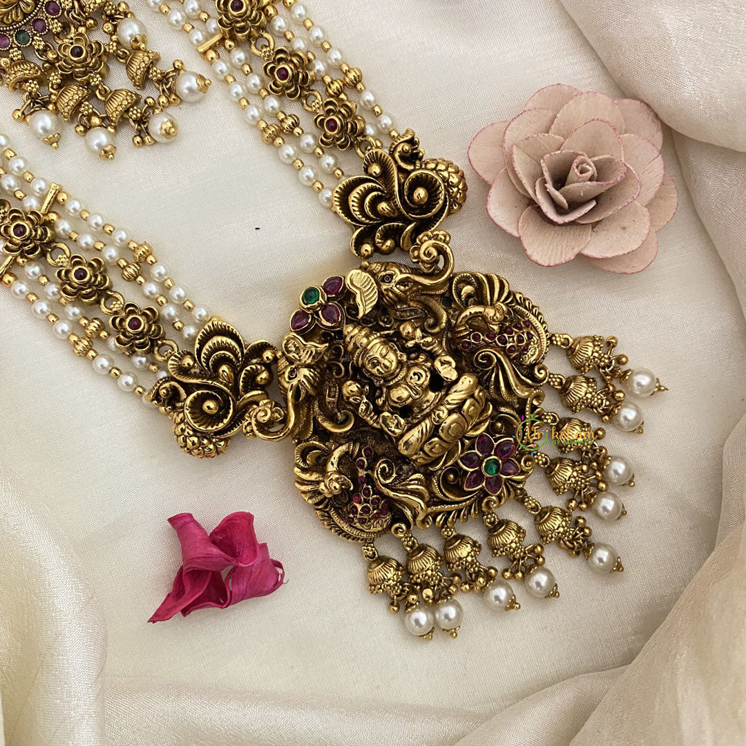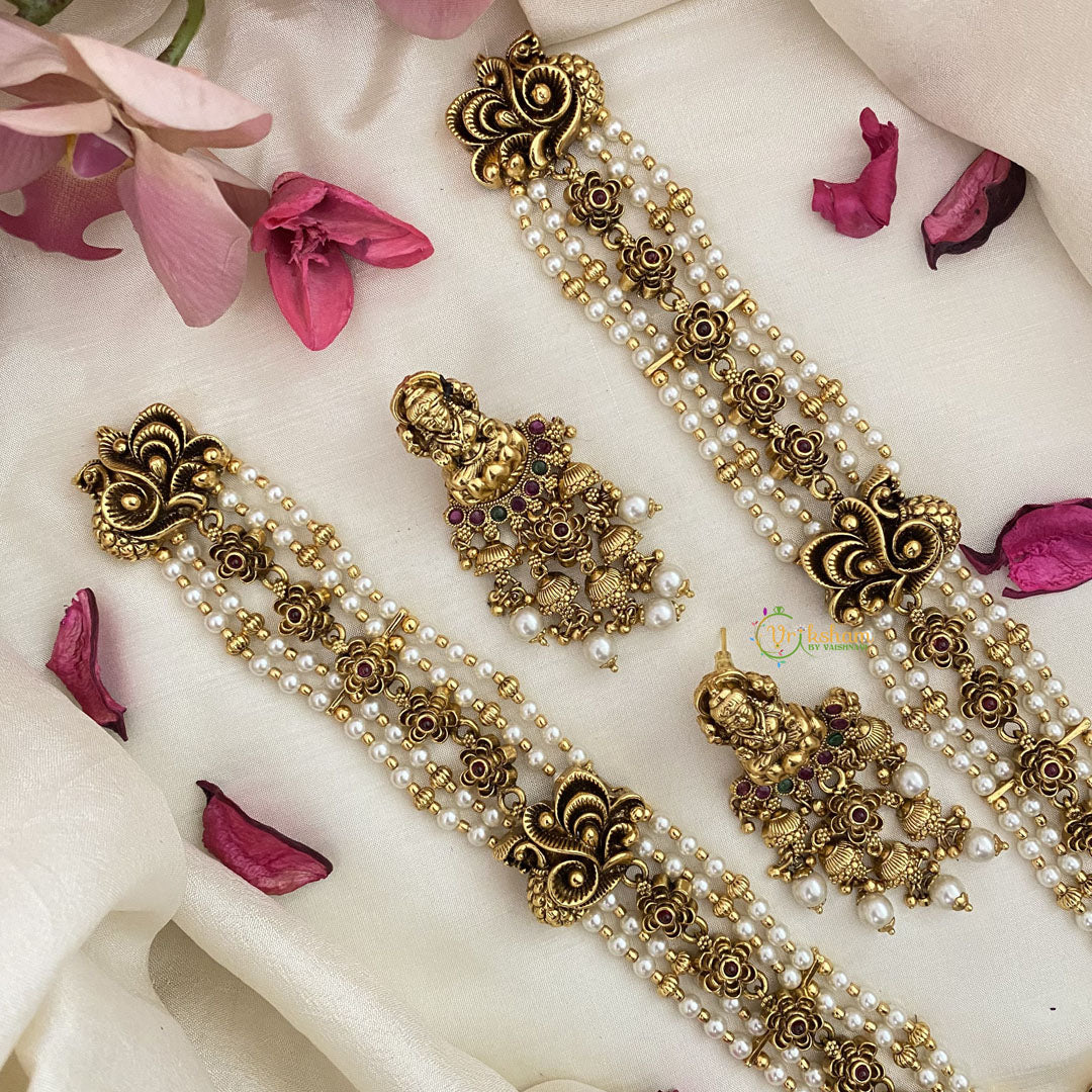 Introducing Vriksham's Premium Lakshmi Pendant Layered White Bead Haram. Elegantly designed with layered white beads, this haram features a stunning pendant of Lakshmi, the goddess of wealth and prosperity. Upgrade your style and attract abundant blessings with this exclusive and luxurious piece.