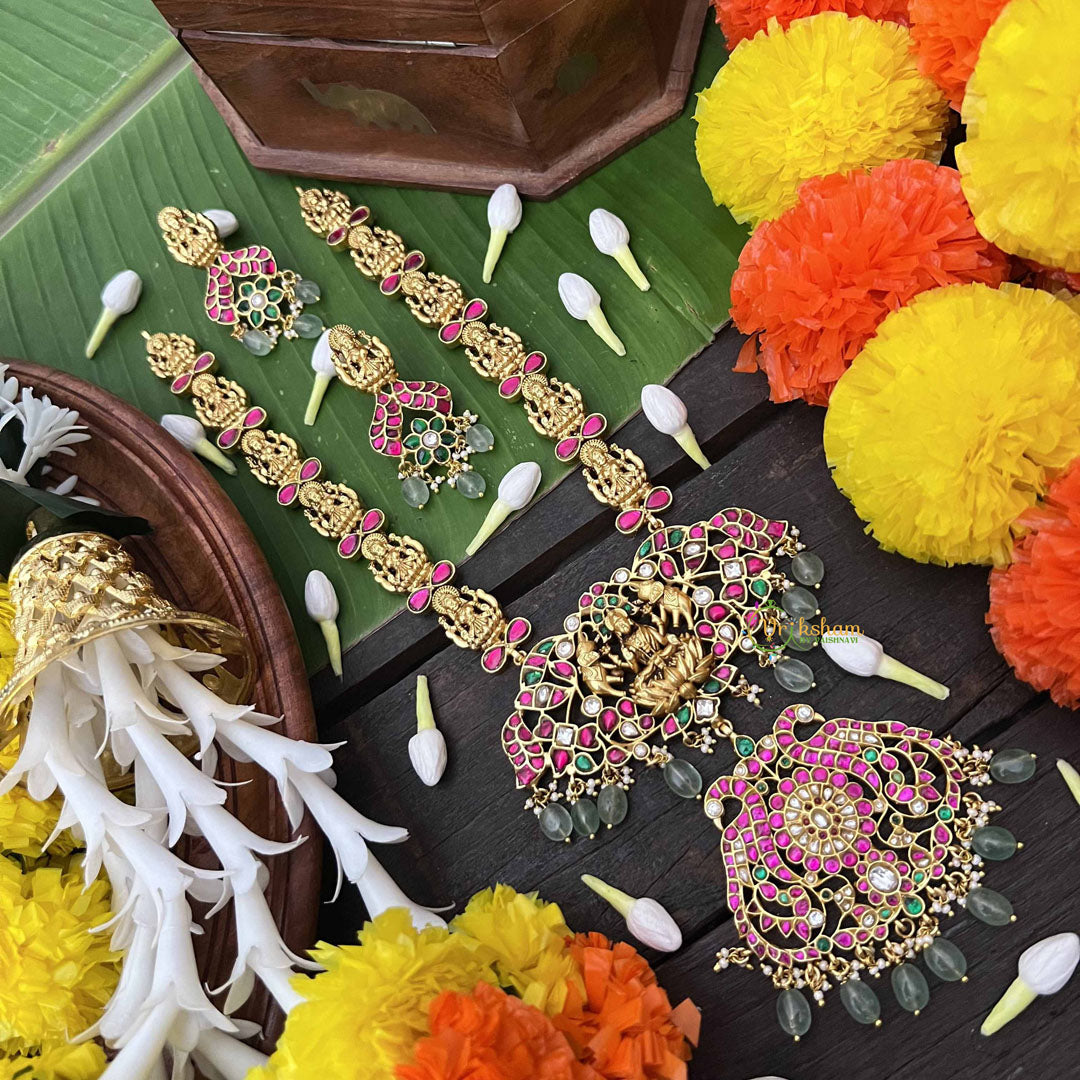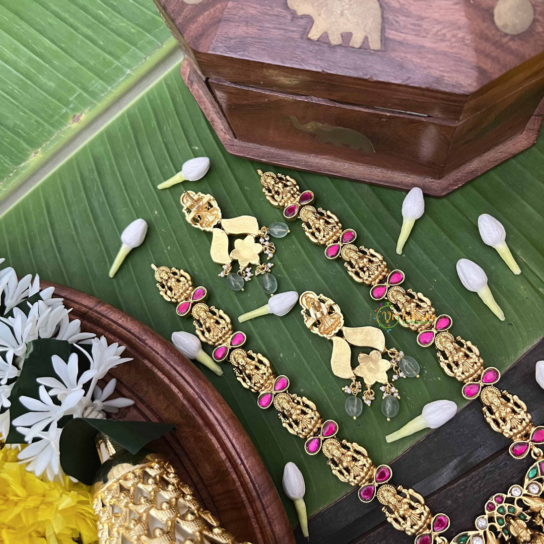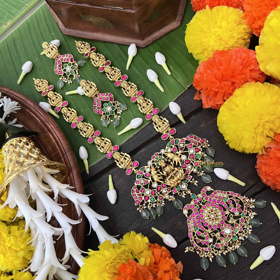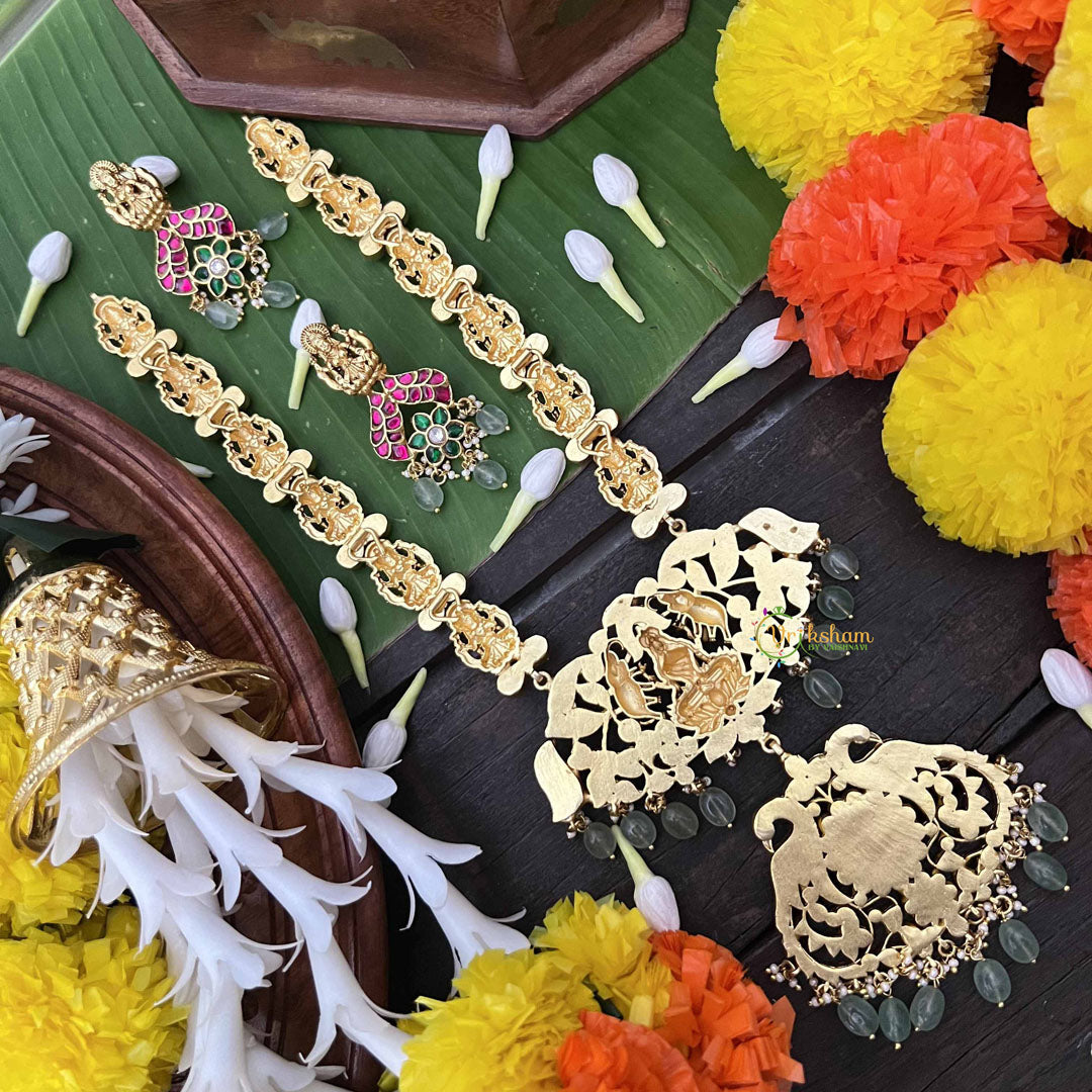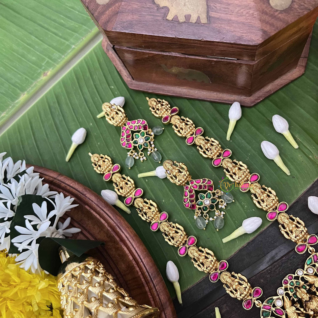 Embrace divine grace with this stunning Lakshmi neckpiece, a testament to refined artisanal excellence. Featuring intricate Kundan Jadau embellishments paired with luminous AD stones and an enchanting peacock design, this long neckpiece radiates opulence. The sophisticated palette of red, green, white, and aqua green beads creates a mesmerizing visual harmony, perfect for special occasions and cultural celebrations. Crafted with meticulous attention to detail, this premium piece embodies the essence of traditional Indian jewelry, offering timeless elegance for the discerning collector.