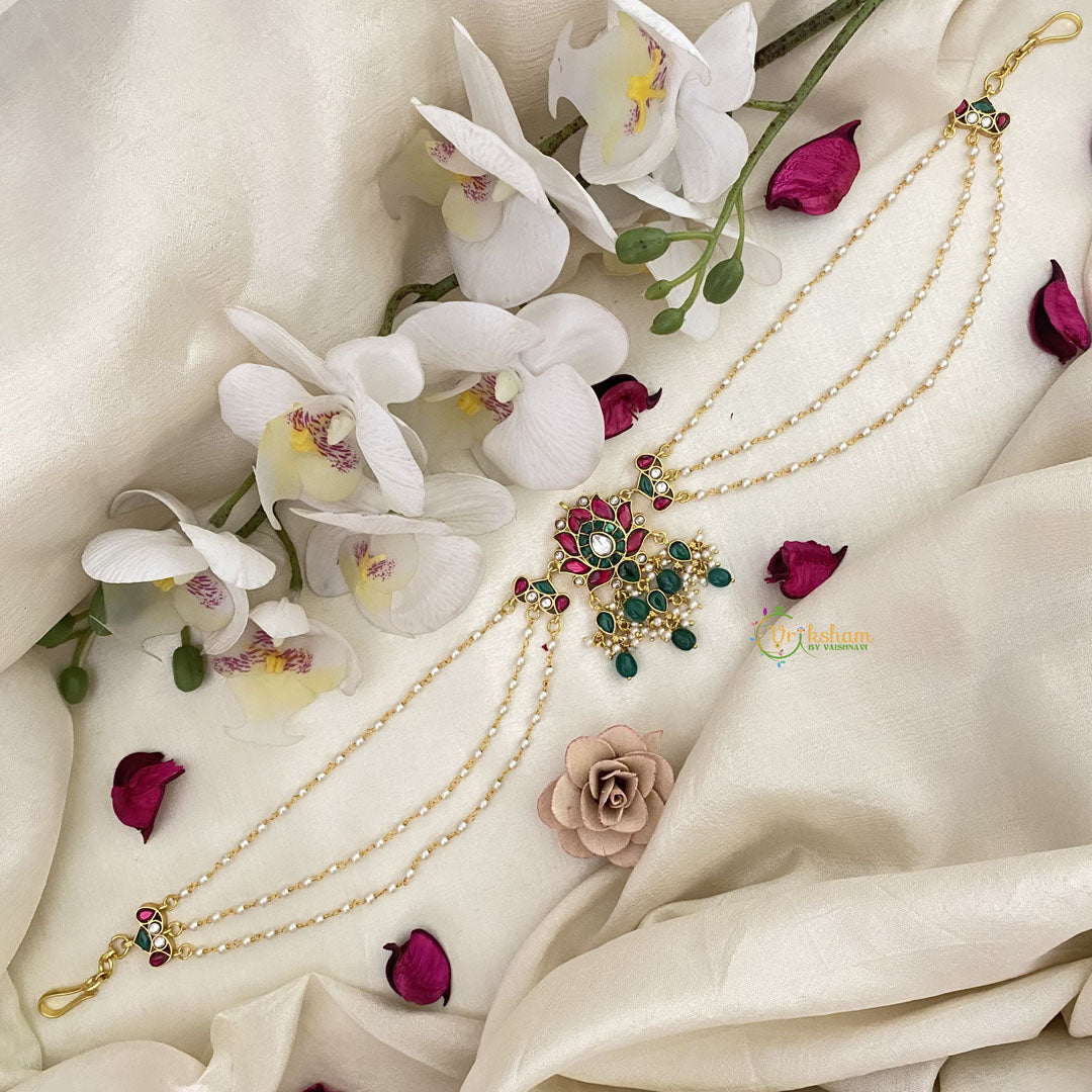 Indulge in luxury with our Vriksham Premium Lotus Kundan Jadau Sheeshphool-Green Bead necklace. Handcrafted with intricate detailing and adorned with stunning green beads, this statement piece will elevate any outfit. Feel like royalty with this exclusive and elegant accessory.