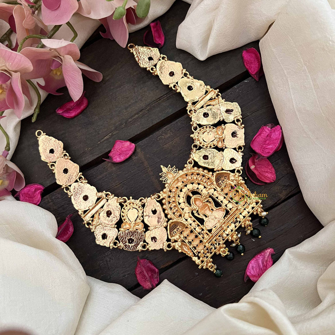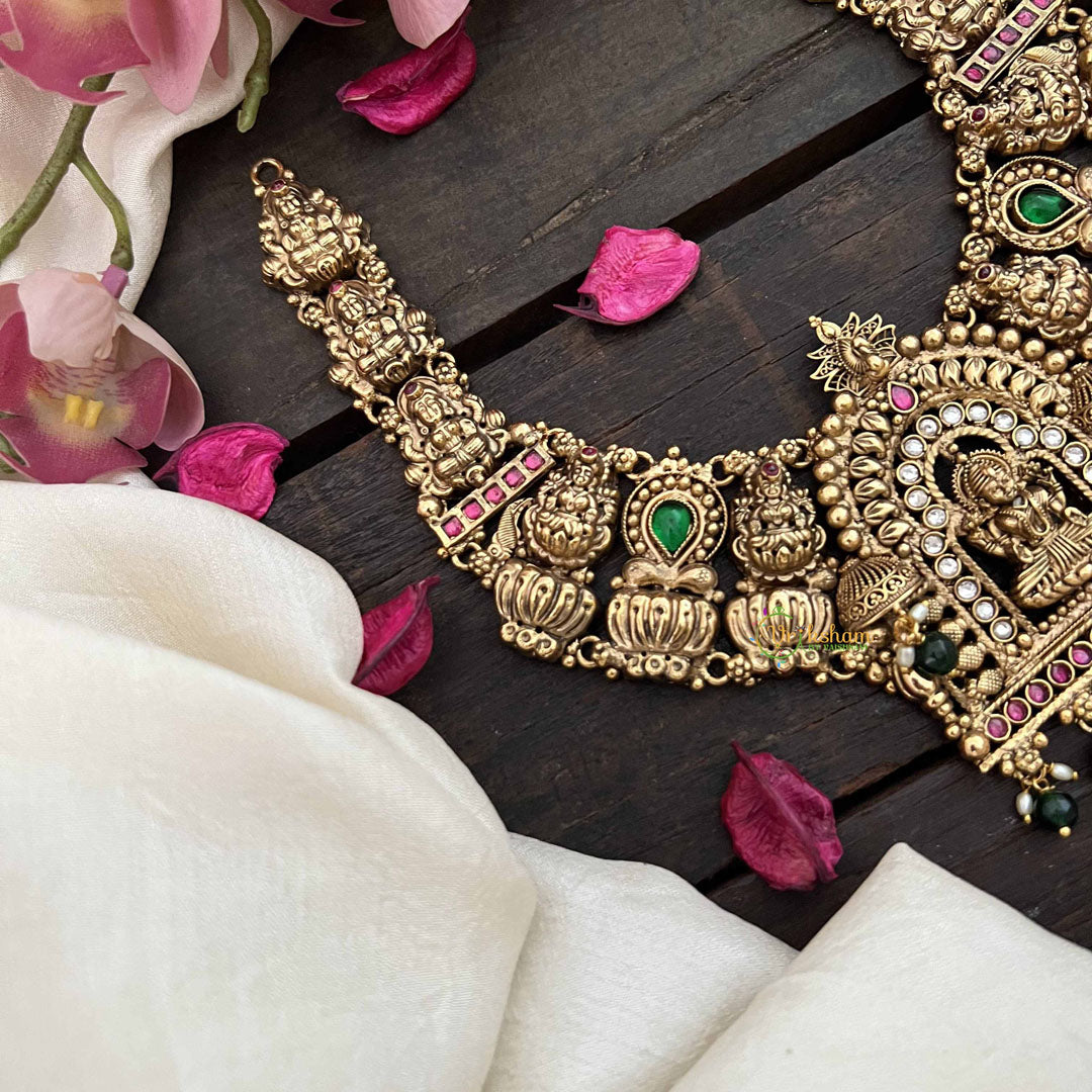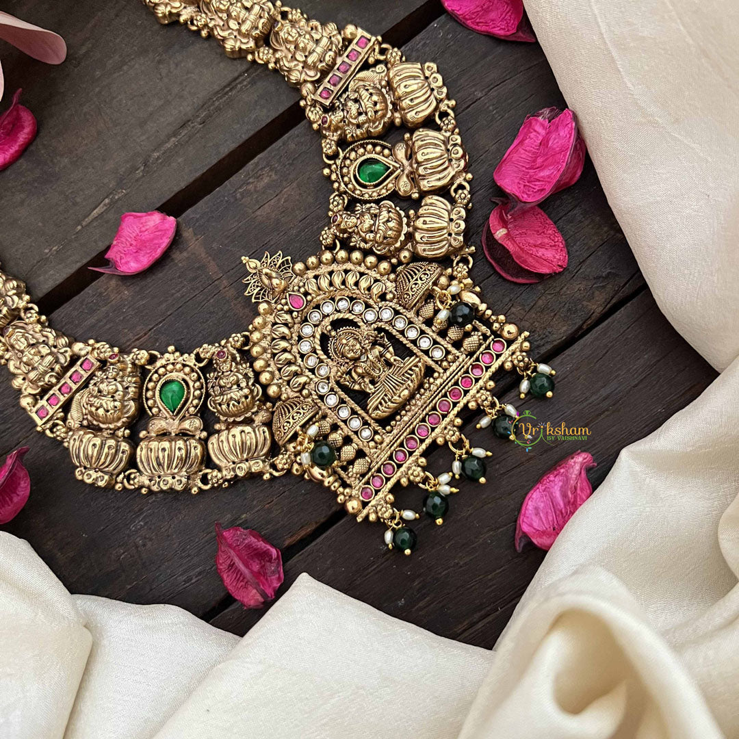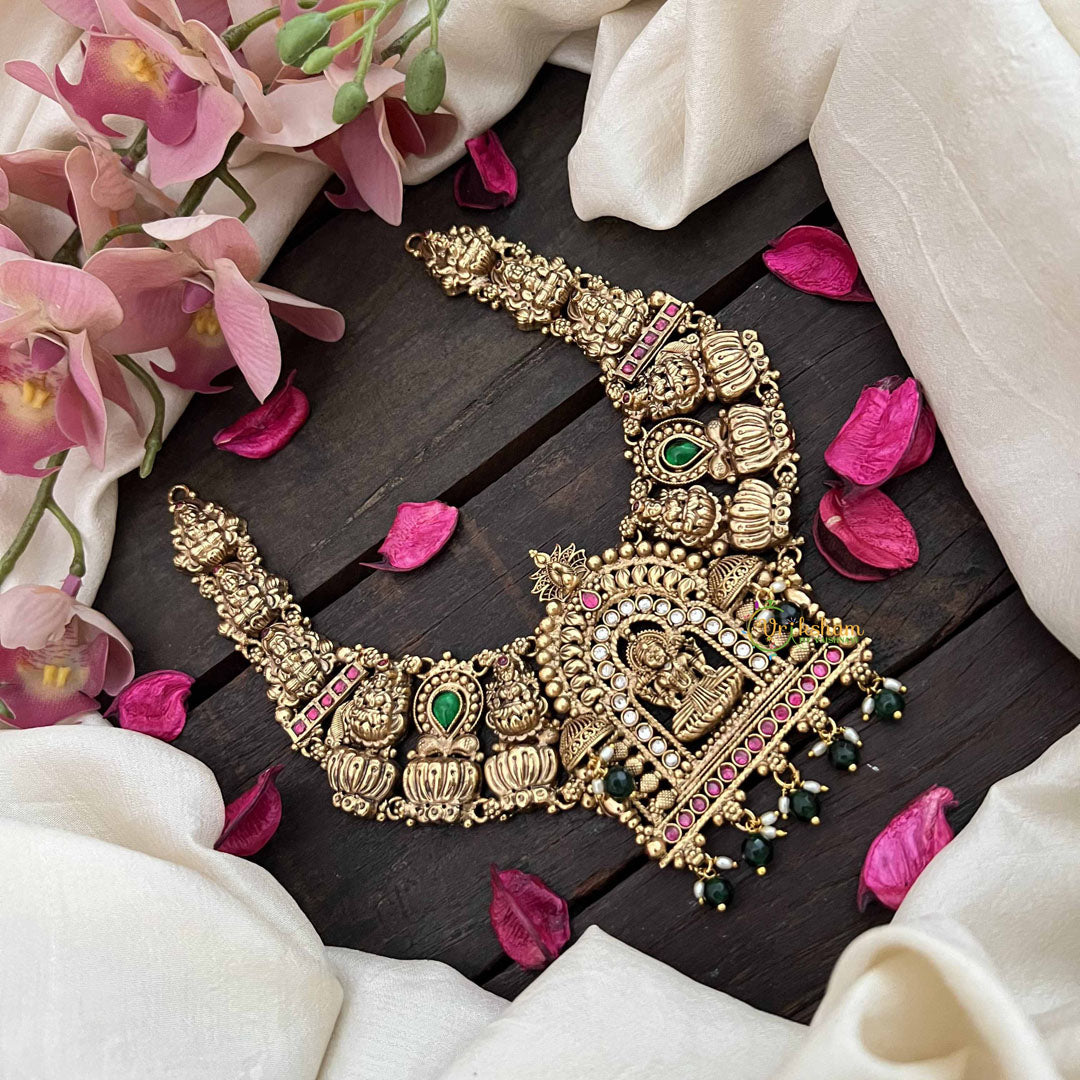 Elevate your spiritual style with this premium Lakshmi Devi temple choker, a masterpiece of devotional elegance. Adorned with the sacred lotus motif and blessed imagery of the goddess of prosperity, this piece combines divine symbolism with refined craftsmanship. The 1 gm gold finish gleams beautifully against lush green beads, creating a harmonious balance of tradition and grace. Designed as a close-fitting choker, it makes a striking statement whether worn for temple visits, festive celebrations, or spiritual occasions. This heirloom-quality piece honors the rich heritage of South Indian temple jewelry while adding an aura of sophistication to your personal adornment.