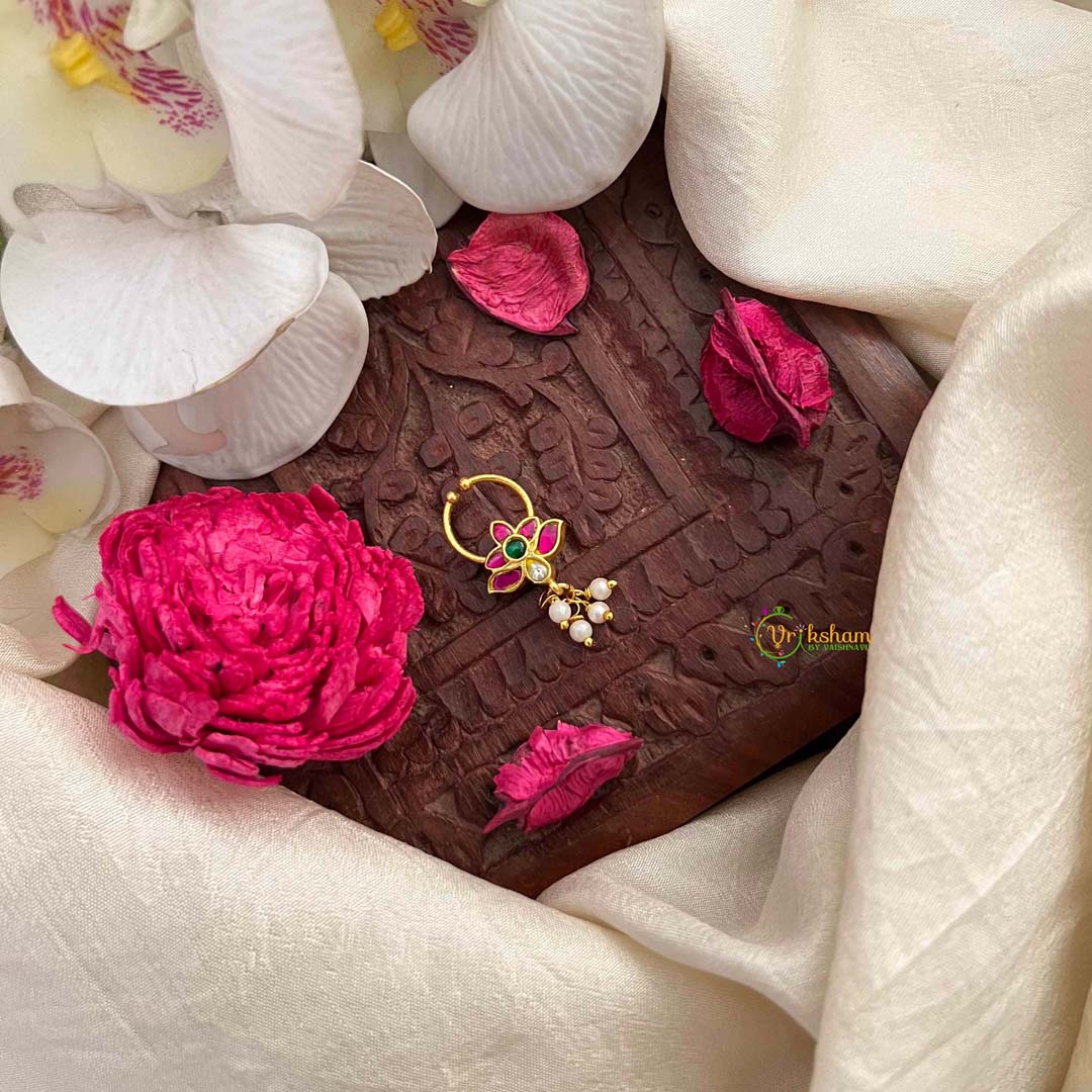 Experience unparalleled luxury with this premium lotus-style reversible kundan jadau septum ring, a pinnacle of refined jewelry artistry. Showcasing exquisite green, red, and white kundan stones arranged in the revered lotus design, this piece exemplifies superior craftsmanship and attention to detail. The innovative reversible construction grants you two sophisticated looks, each side featuring impeccable jadau work that reflects generations of mastery. The lotus motif symbolizes elegance and spiritual grace, while the premium quality ensures lasting brilliance and durability. Designed for the discerning collector who demands nothing less than exceptional artistry, this septum ring stands as a distinguished investment in timeless beauty and cultural heritage.