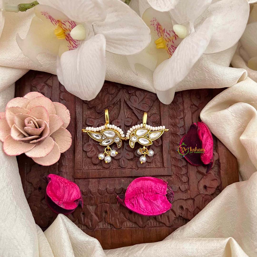 Experience unparalleled elegance with this Premium Parrot Style Kundan Jadau Bugadi in pristine white, a distinguished creation of masterful artisanal tradition. The iconic parrot motif, rendered in luminous Kundan with delicate pearl embellishments, symbolizes grace and cultural heritage. Every detail reflects meticulous craftsmanship, with pearls strategically placed to enhance the design's inherent beauty and radiance. The monochromatic white palette exudes understated luxury, making this piece versatile for both bridal and festive occasions. A sophisticated accessory that celebrates timeless artistry while commanding admiration through its refined execution. This bugadi represents an heirloom-quality investment, embodying elegance that transcends generations.