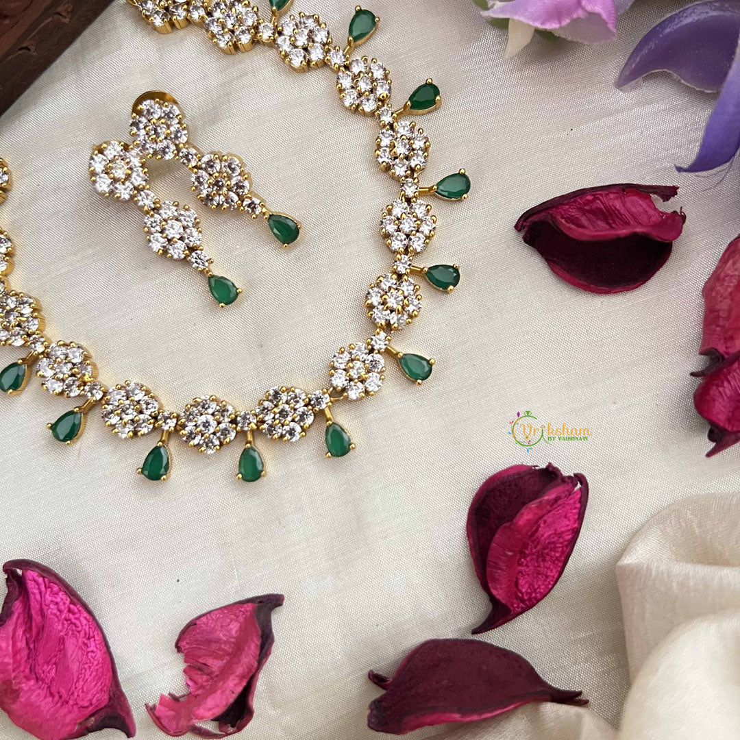 This premium party wear neckpiece showcases an elegant floral design embellished with radiant green AD stones. Crafted for sophistication and style, it offers a graceful accent to elevate your ensemble for special occasions and festive celebrations.