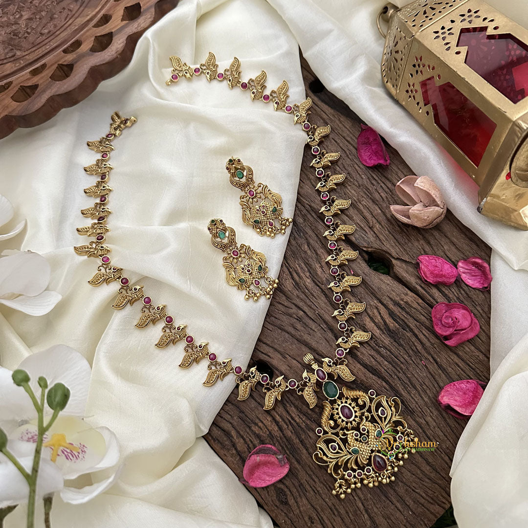 Indulge in luxurious artistry with our Vriksham Premium Peacock Long Neckpiece in vibrant red and green hues, adorned with stunning gold beads. This exclusive accessory captures the graceful majesty of a peacock, making a statement of sophistication and elegance. Elevate your style with this premium piece.