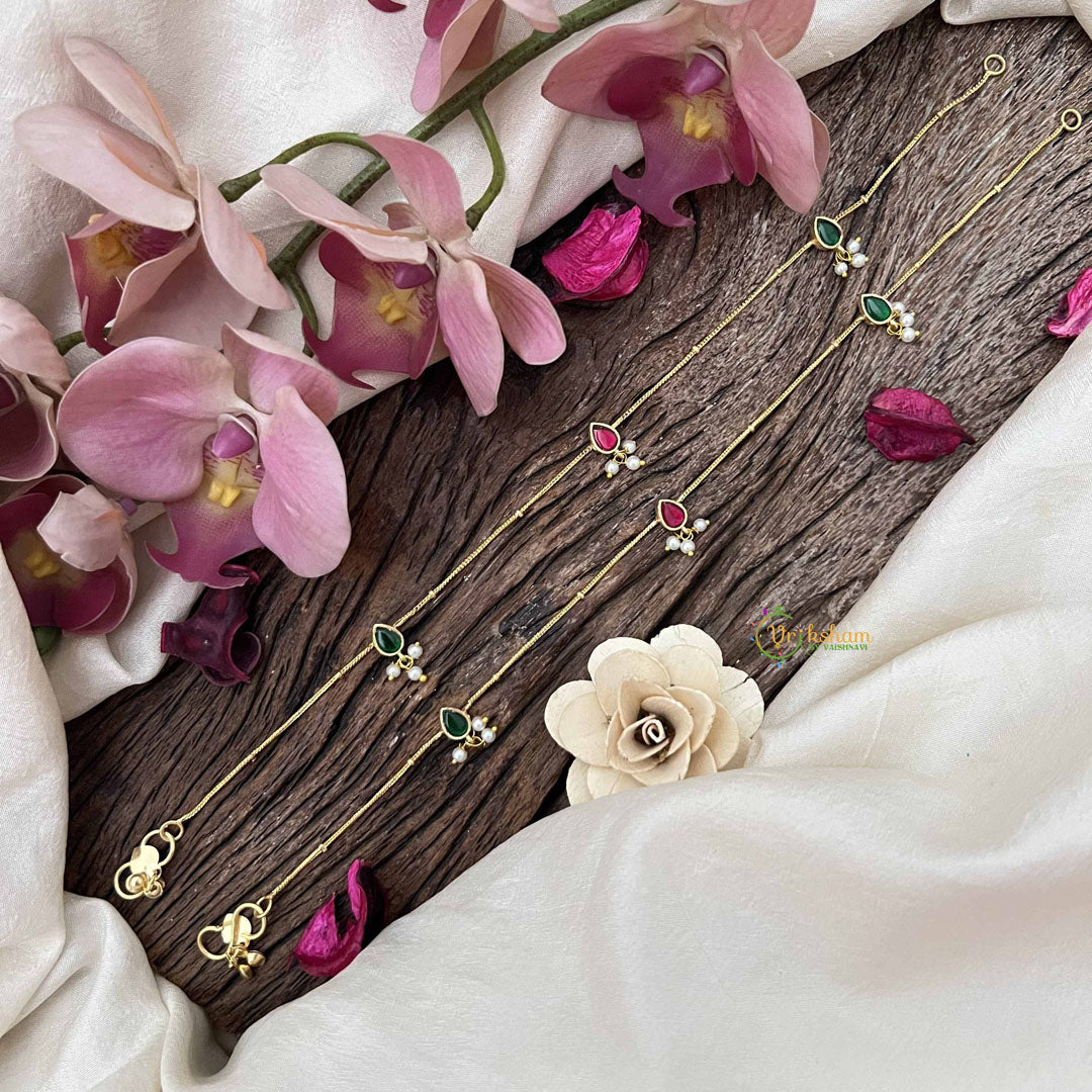 Elevate your elegance with Vriksham’s Premium Pear Shape With Pearls Drop Gold Look Alike Anklets in Red and Green. Featuring exquisite pear-shaped elements adorned with delicate pearls, these anklets blend vibrant colors with a luxurious gold-inspired finish. Perfect for adding a sophisticated and timeless appeal to your special occasions.