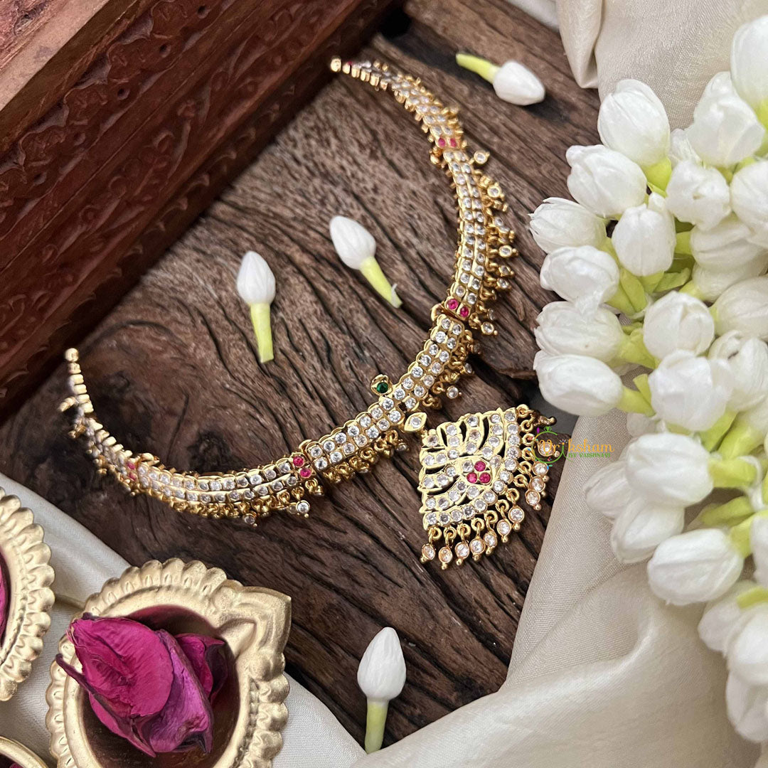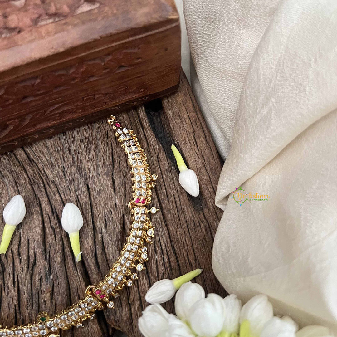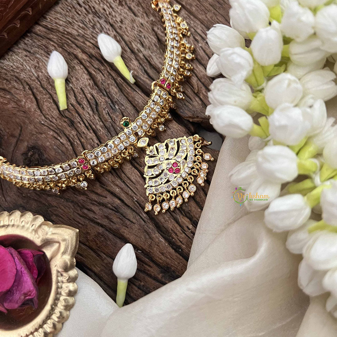 Experience luxury redefined with this premium pendant neckpiece, a masterwork of refined design and exceptional craftsmanship. The sophisticated pendant showcases a harmonious palette of white, red, and green, creating visual depth and cultural resonance. Adorned with cascading diamond drops that sparkle with pristine brilliance, this short neckpiece elevates any occasion with understated opulence. The carefully curated color combination offers versatility, complementing both traditional and contemporary ensembles with effortless grace. Each element is meticulously positioned to maximize luminosity and aesthetic impact, resulting in a piece that commands attention without demanding it. Ideal for discerning collectors and those seeking investment-worthy jewelry, this neckpiece represents the pinnacle of sophisticated artistry, destined to become a treasured heirloom that transcends generations.