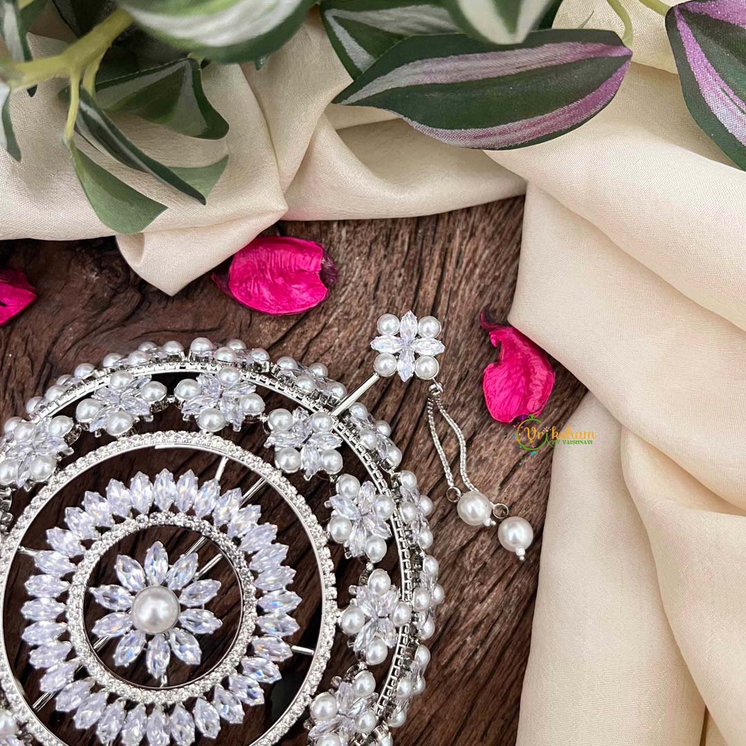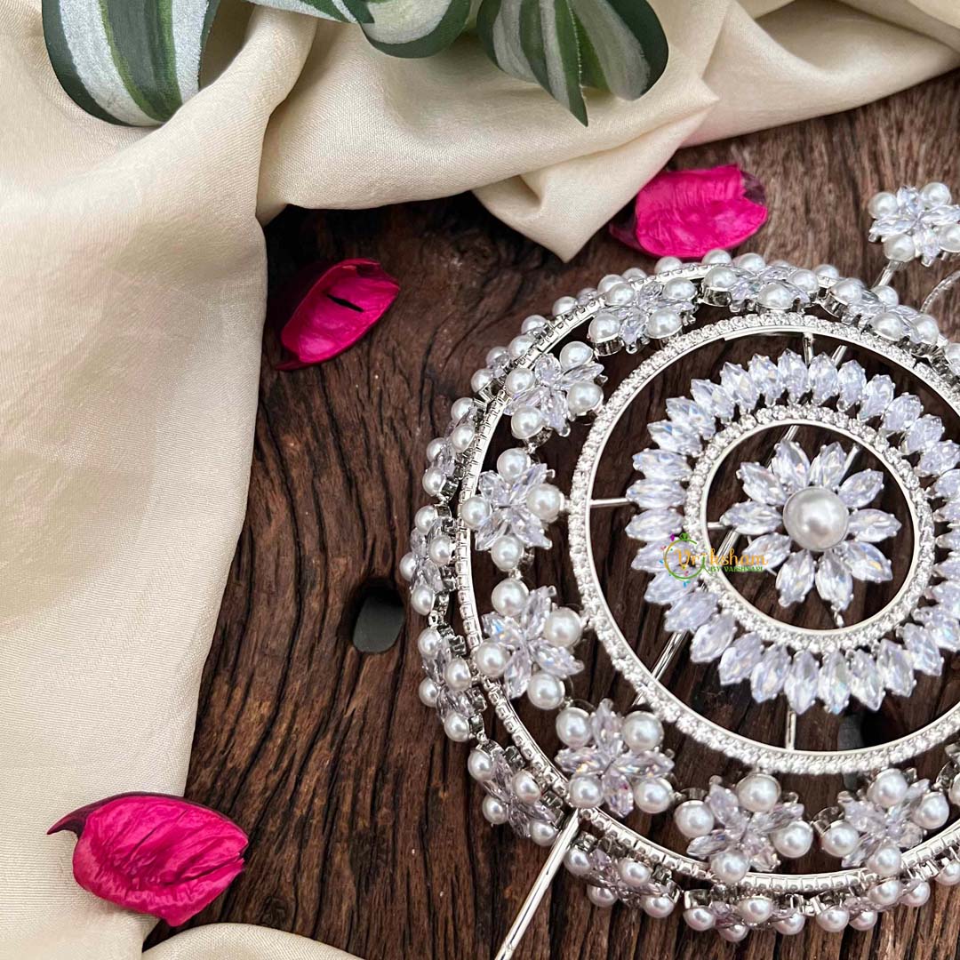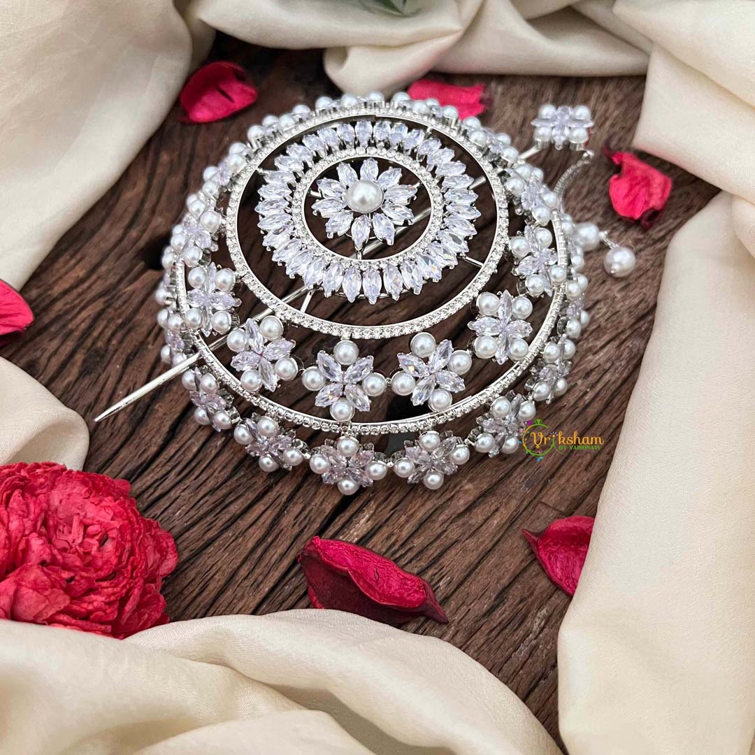 Elevate your hairstyle with this exquisite bun ornament, crafted from premium silver with an intricate floral design. Adorned with lustrous pearls and sparkling CZ stones, this hair bun cage accessory adds refined elegance to any updo. Perfect for weddings, festivals, or special occasions, it secures your bun while creating a stunning focal point. The delicate craftsmanship and timeless design make it an essential accessory for those who appreciate sophisticated beauty and traditional charm.