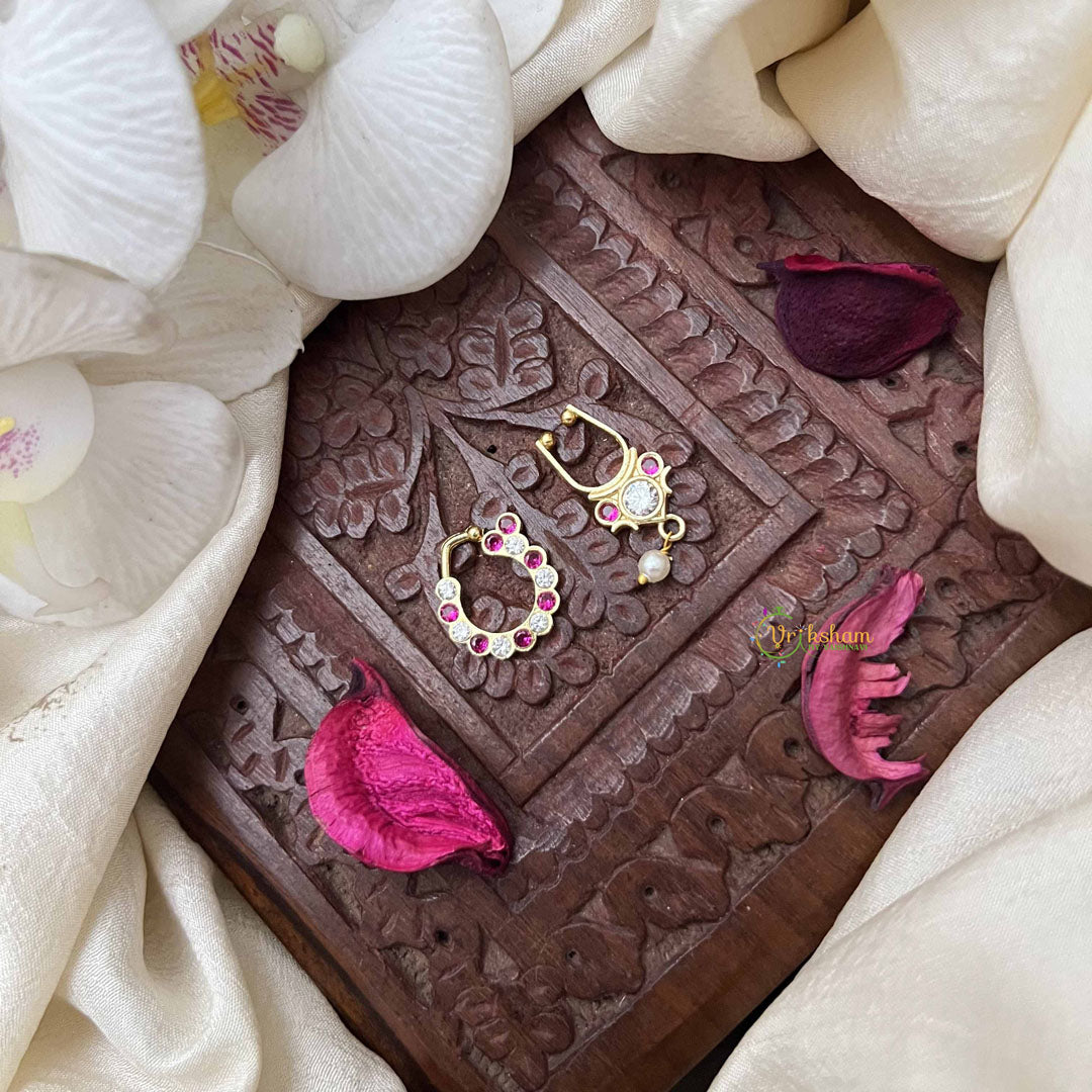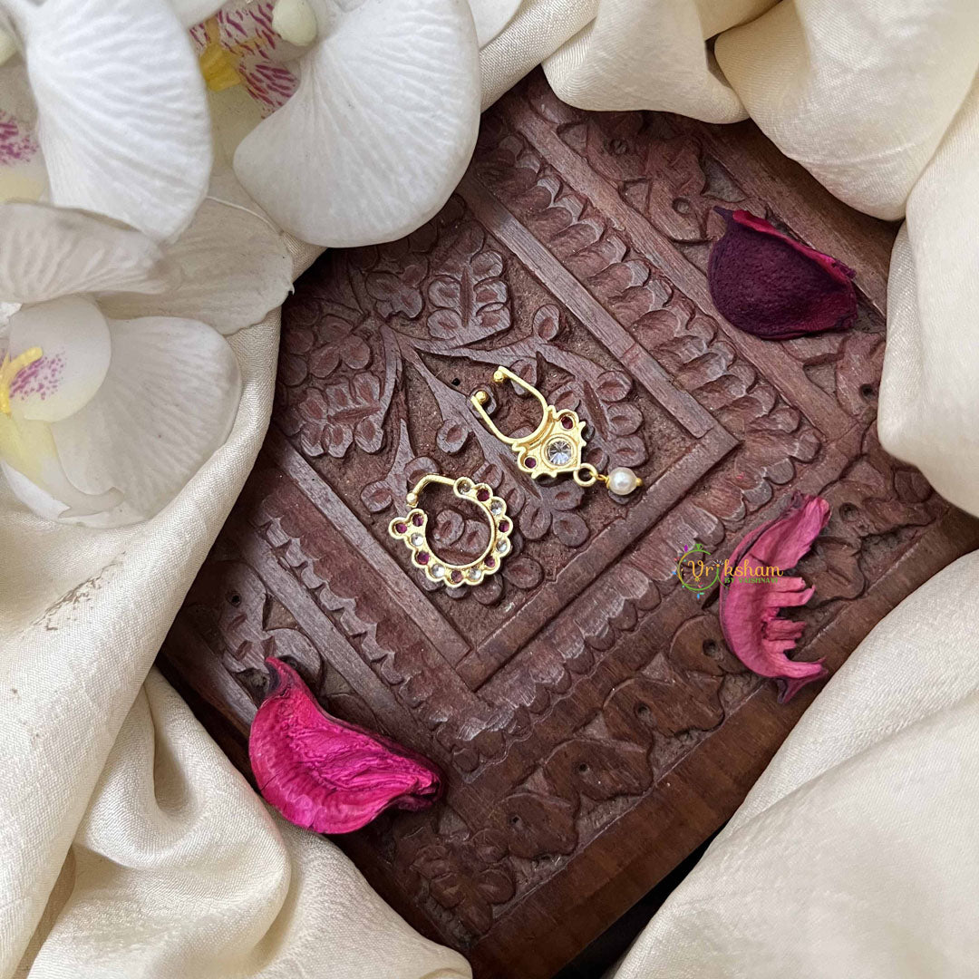 Golden Naths/Nose ring for Non - Pierced Nose. People who do not have piercing do not have to worry about not being able to wear naths. These nose rings helps people with non pierced nose also wear the same with a screw like holding. The moment you see the nath you will be able to understand how it will sit on the nose.