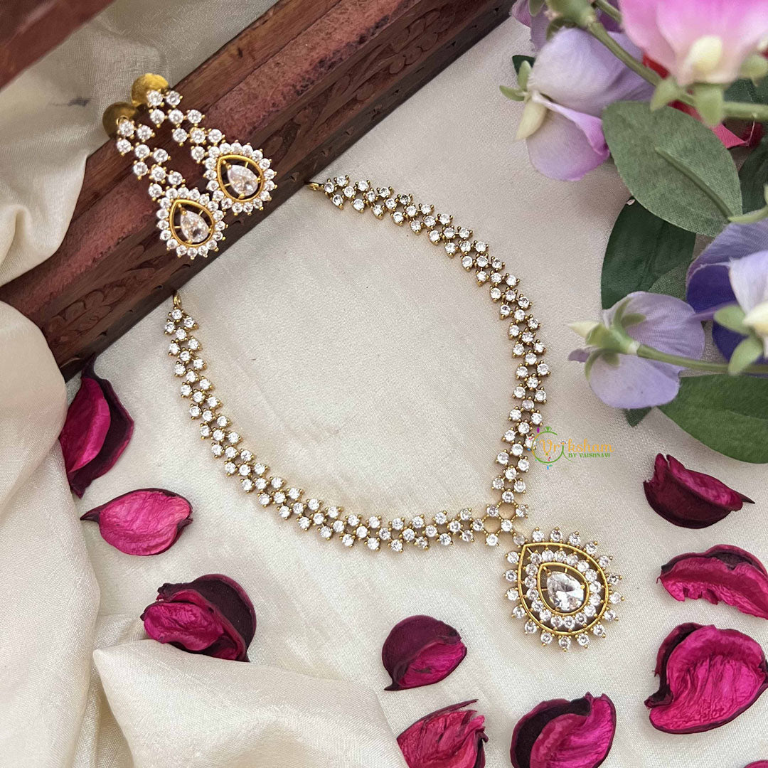 Elevate your elegance with the Vriksham Premiums AD Stone Pear Design Neckpiece in pristine white. Featuring expertly crafted AD stones arranged in a graceful pear design, this neckpiece offers a refined shimmer that enhances any ensemble. Its sophisticated style makes it an exquisite choice for special occasions, adding subtle luxury and timeless charm to your look.