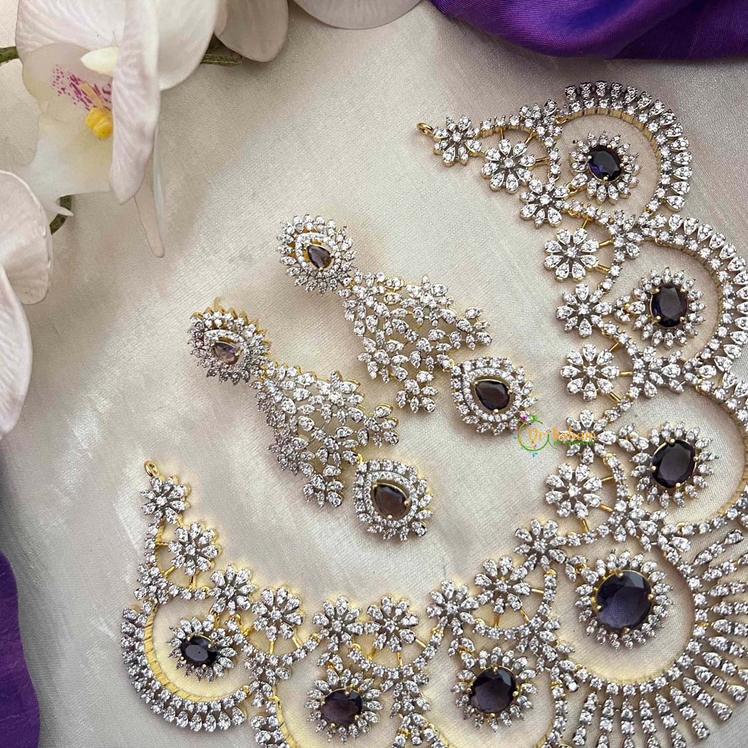 Celebrate refined beauty with this enchanting short neckpiece, showcasing a scalloped design adorned with sparkling American diamonds that frame a graceful floral drop. The regal purple tones evoke elegance and sophistication, while the delicate floral pendant adds romantic charm and movement. The scalloped edges create a soft, feminine silhouette that flatters the neckline beautifully. Ideal for festive celebrations, weddings, and formal gatherings, this piece captures the essence of timeless artistry with contemporary sparkle. A versatile treasure that brings an air of refined grace and botanical-inspired beauty to any occasion, perfect for those who appreciate intricate craftsmanship and understated luxury.