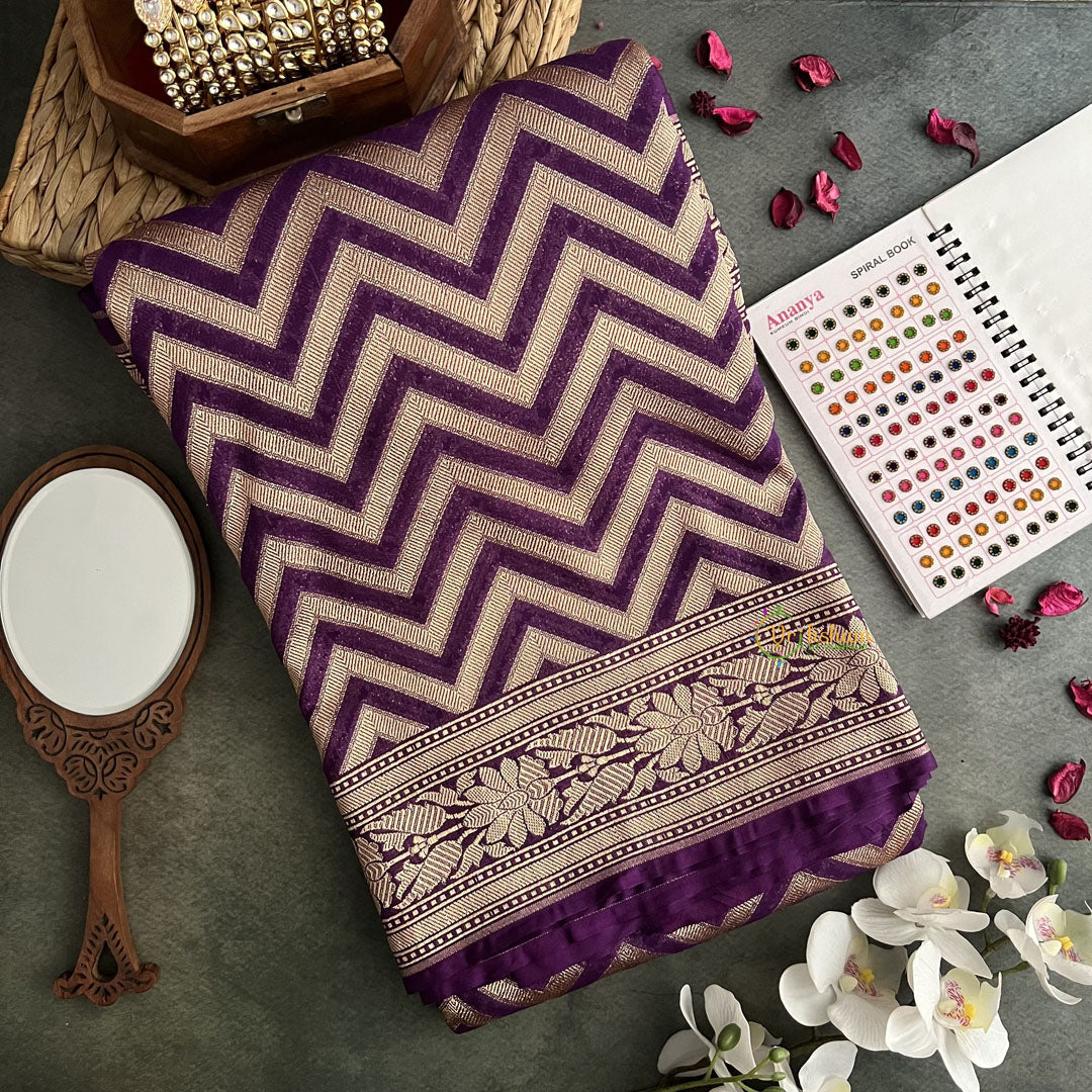 Indulge in the rich weaving traditions of Banaras with our Vriksham Purple Georgette Silk Banarasi Saree. Handloomed with an exquisite floral zig zag design, this saree exudes luxury and elegance. Elevate your style and stand out in any occasion with this sophisticated piece.