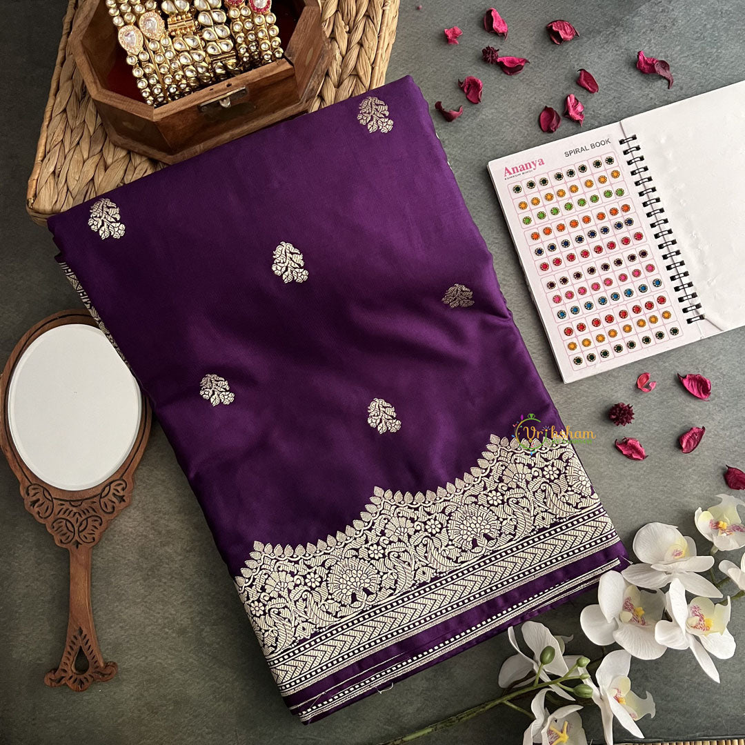 Indulge in the opulent beauty of Vriksham Purple Mashru Satin Silk Banarasi Saree. Made with smooth fabric and featuring a designer rich pallu, this saree exudes luxury and sophistication. Elevate your wardrobe with this exquisite piece that is perfect for any exclusive event.