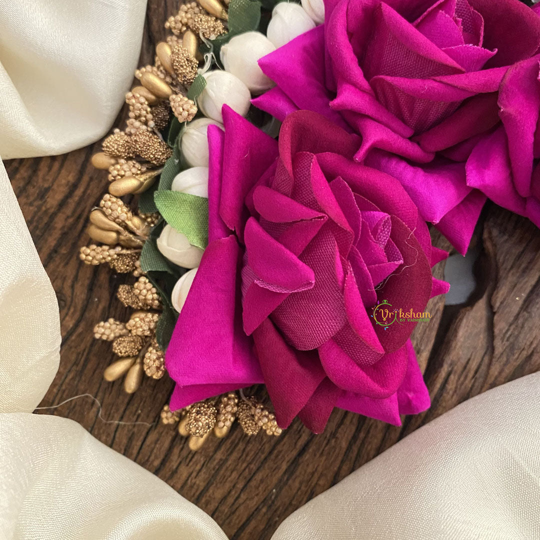 Elevate your look with Vriksham's Purple Rose Veni, adorned with intricate gold beads. This luxurious flower accessory adds a touch of sophistication and exclusivity to any outfit. Perfect for special occasions or everyday glamour.