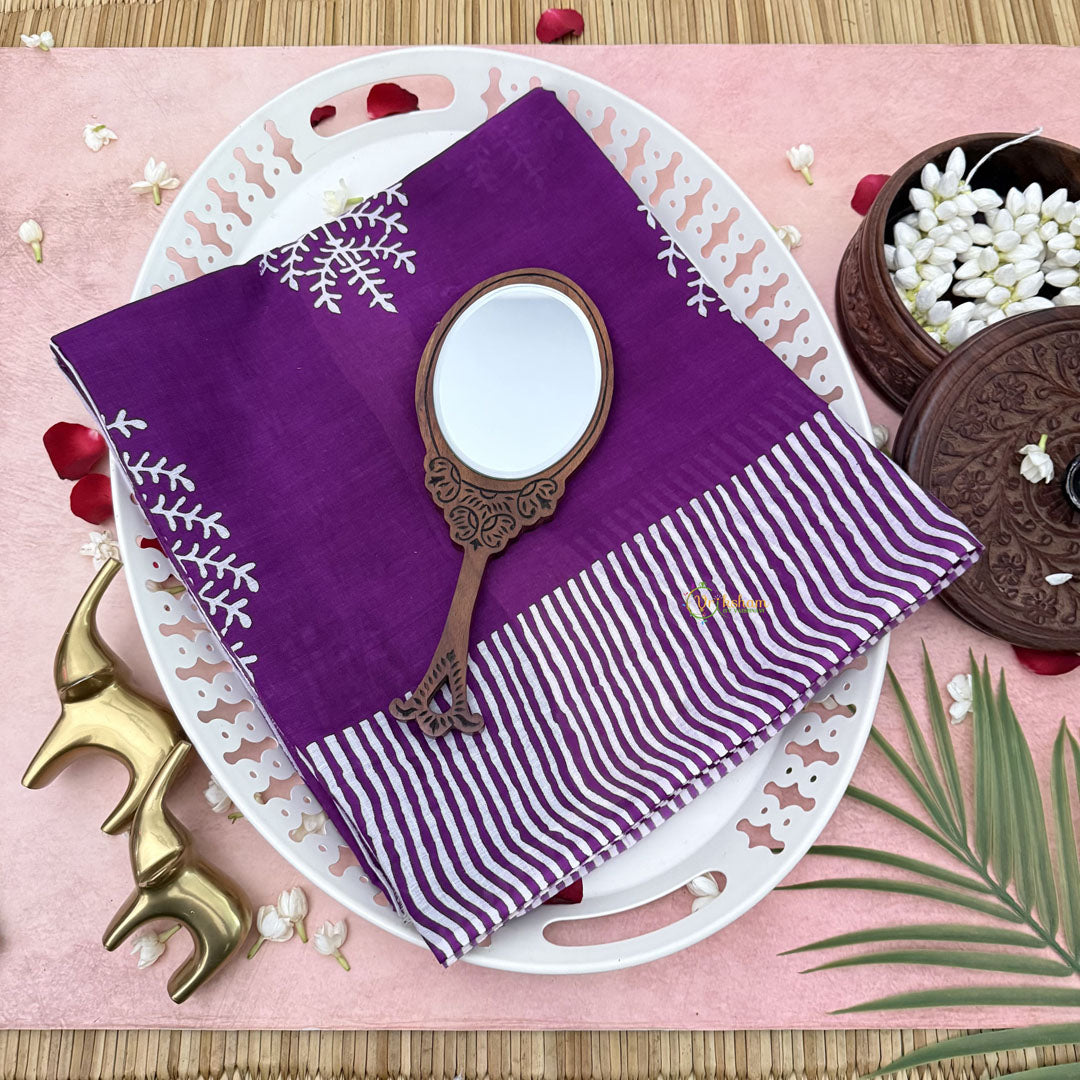 The Vriksham Purple With Leaf Printed Cotton Mulmul Saree showcases a graceful blend of rich purple fabric adorned with delicate leaf motifs. Made from soft, breathable cotton mulmul, it offers both comfort and elegance. This saree is an ideal choice for those seeking a sophisticated yet understated look for any occasion.