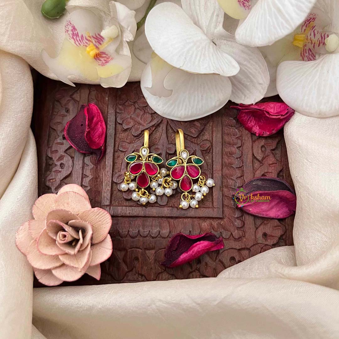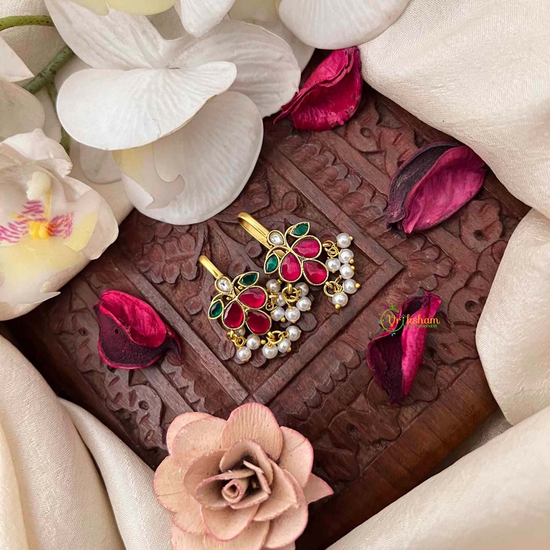 Elevate your jewelry collection with this magnificent Pushpika Style Pearl Drop Kundan Jadau Bugadi, showcasing an enchanting fusion of green, red, and white gemstones. Each stone is meticulously hand-set using the revered kundan and jadau techniques, creating a harmonious interplay of color and light. The delicate pearl drops cascade with ethereal grace, adding dimension and movement to this heirloom-quality piece. The vibrant color palette celebrates Indian artistry while maintaining sophisticated restraint, making it perfect for weddings, festivals, and momentous celebrations. A testament to masterful craftsmanship, this bugadi is destined to become a treasured keepsake passed through generations.