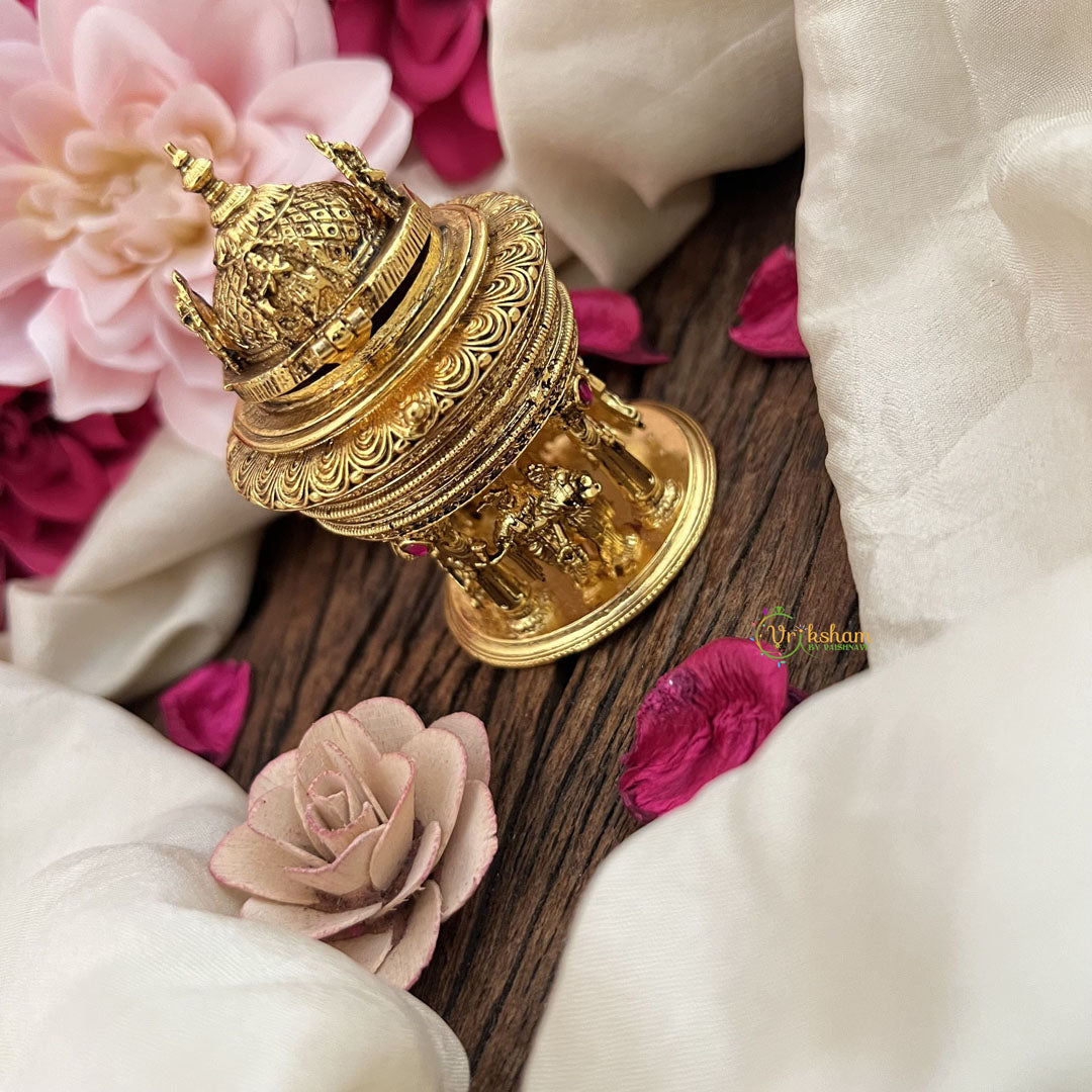 Elevate your sacred rituals with the Vriksham Radha Krishna Gopuram Temple Kumkum Box. Crafted with intricate detailing inspired by traditional temple architecture, this elegant box offers a refined way to store kumkum. Its sophisticated design not only preserves the purity of your kumkum but also adds a touch of spiritual grace to your prayer space. Perfect for devotees seeking both functionality and aesthetic harmony in their devotional accessories.