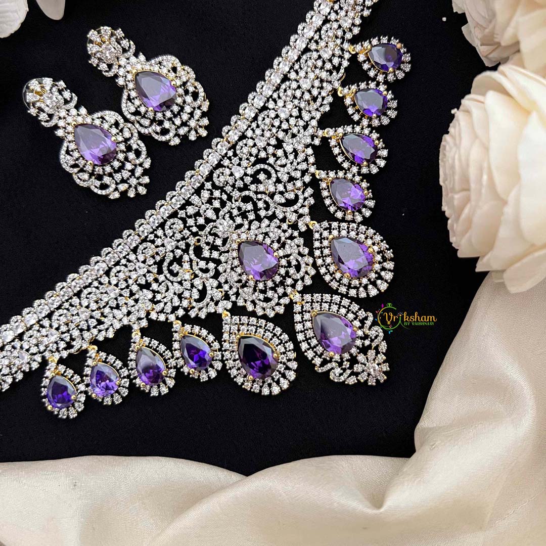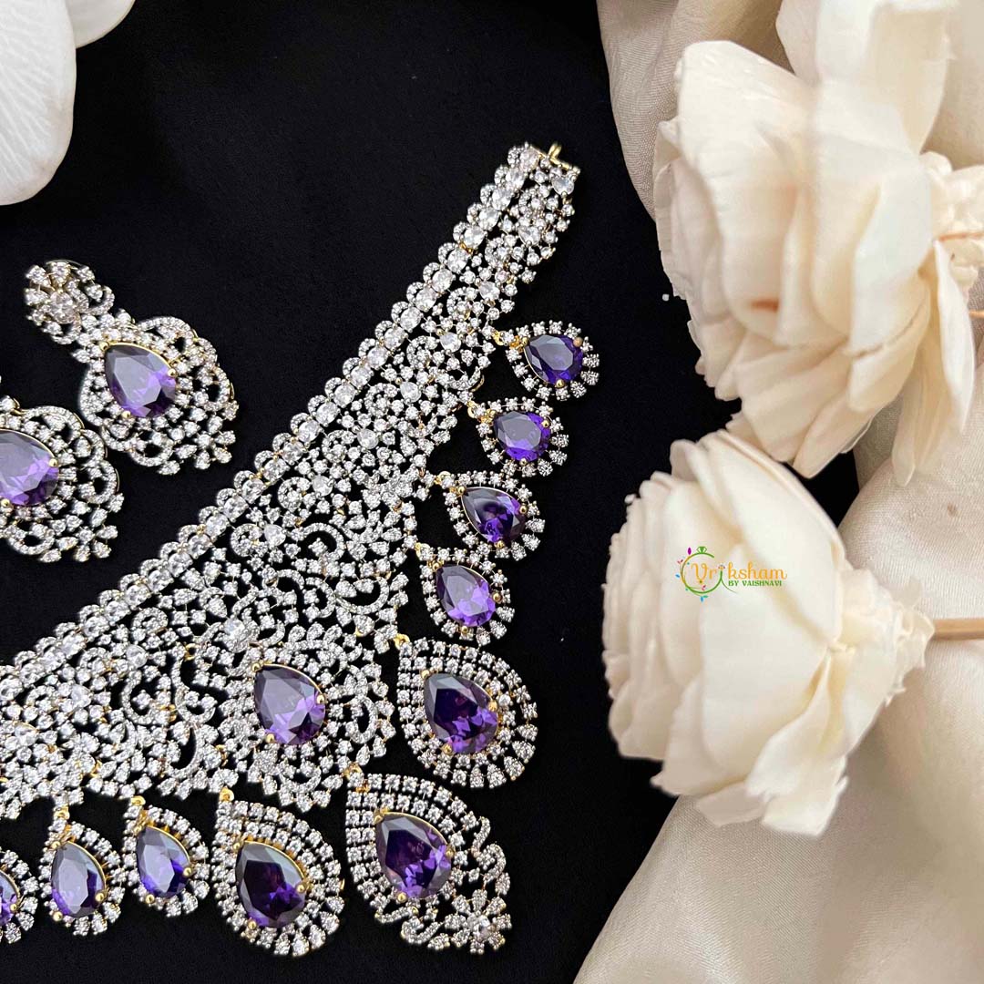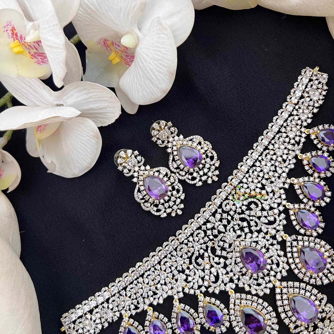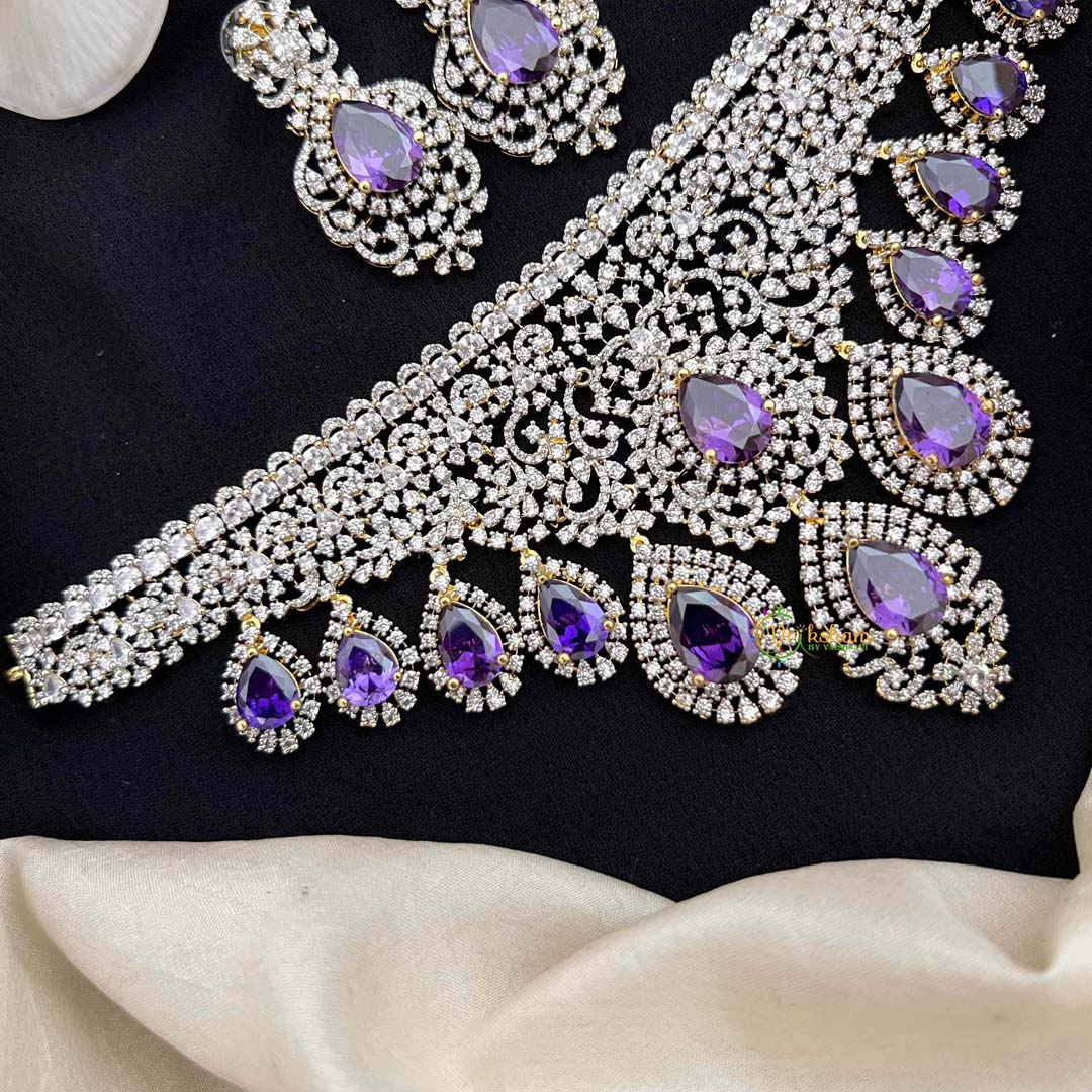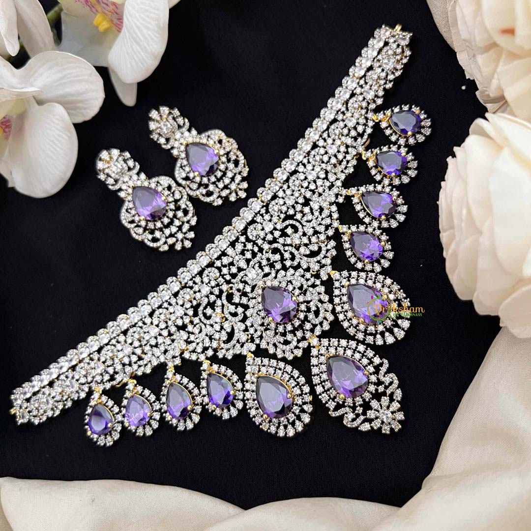 Make a striking statement with this radiant choker neckpiece, featuring a distinctive V-shaped silhouette adorned with brilliant American diamonds and graceful purple teardrop fringe. The geometric V-design creates an elegant focal point at the neckline, while cascading teardrop elements add movement and dimension. Sparkling diamonds frame the purple accents, producing a luminous interplay of light and color that captures attention effortlessly. This sophisticated piece seamlessly blends contemporary design with traditional craftsmanship, making it an ideal choice for weddings, festive celebrations, and formal occasions where bold elegance is appreciated.