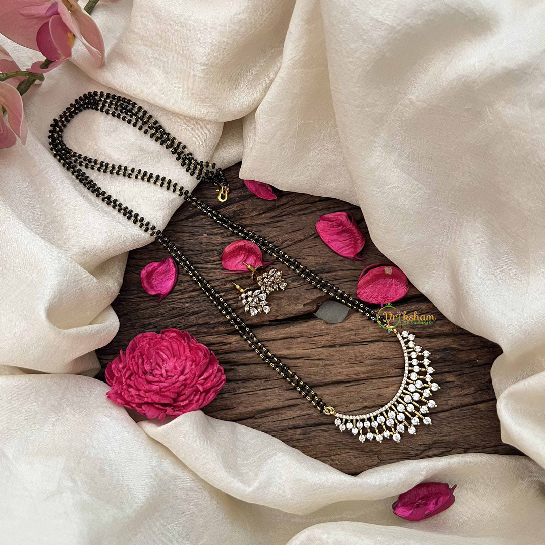 The Vriksham Radiant Drop AD Stone Mangalsutra features a captivating drop-shaped design adorned with dazzling AD stones. This elegant piece blends timeless tradition with contemporary refinement, offering a sophisticated expression of love and commitment that enhances any ensemble with subtle brilliance.