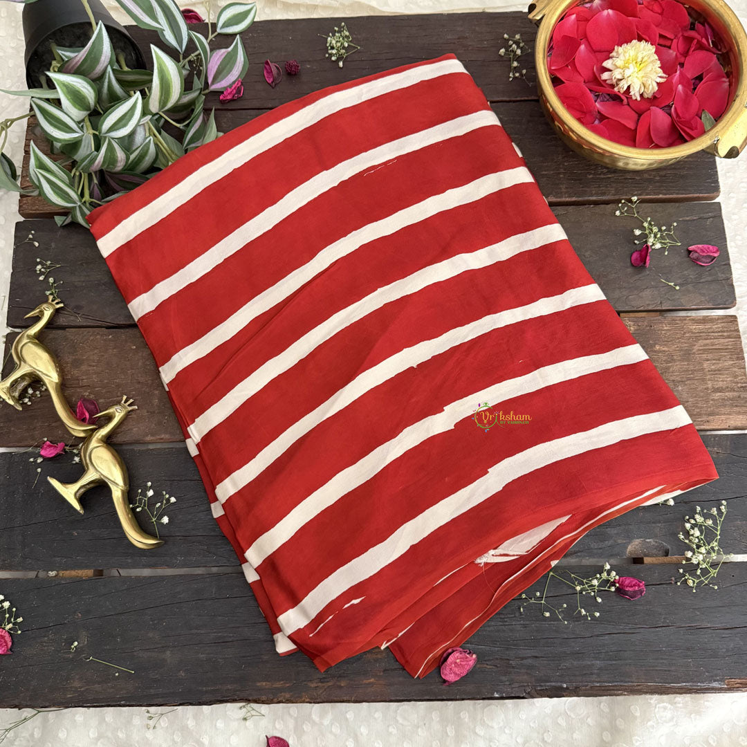 The Vriksham Radish Red With Off White Striped Print Ajrakh Modal Silk Saree features a vibrant radish red base accented with subtle off-white stripes, crafted with traditional Ajrakh techniques on soft modal silk. Its elegant drape and lightweight fabric make it perfect for sophisticated occasions, blending timeless artistry with modern refinement.