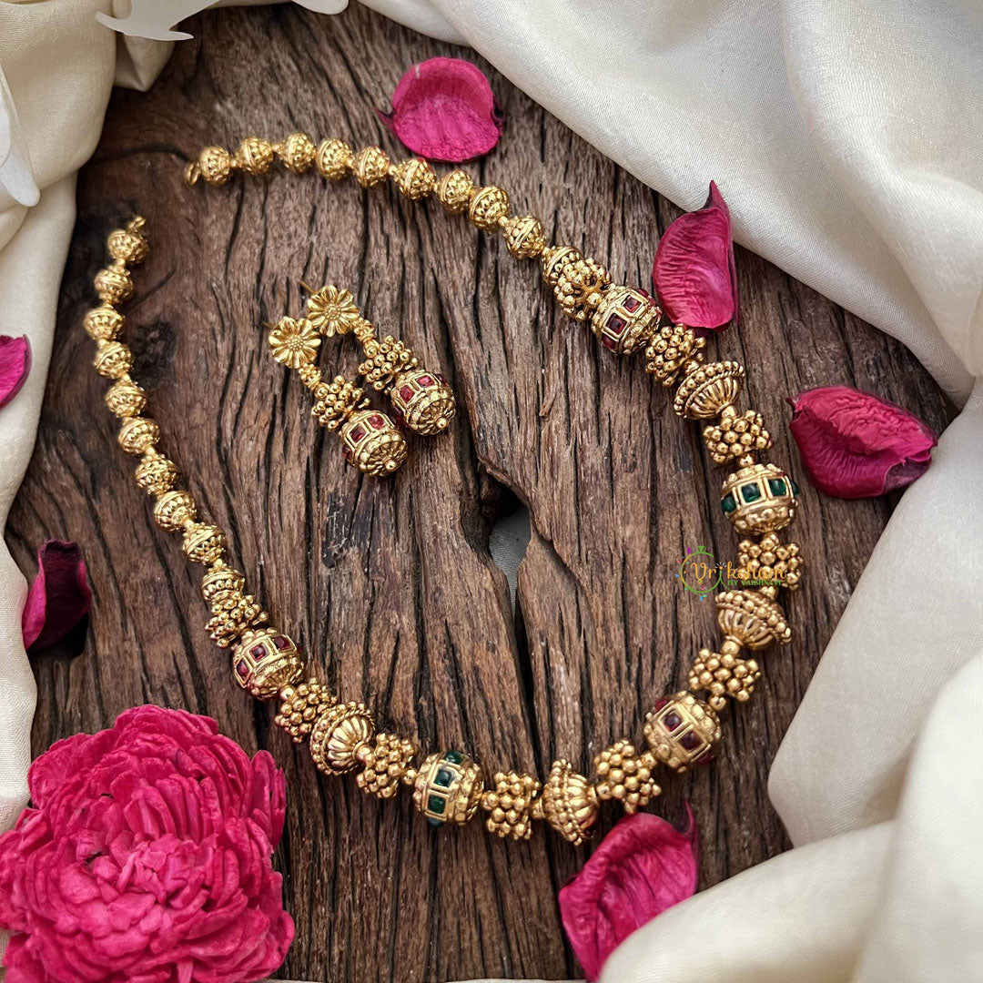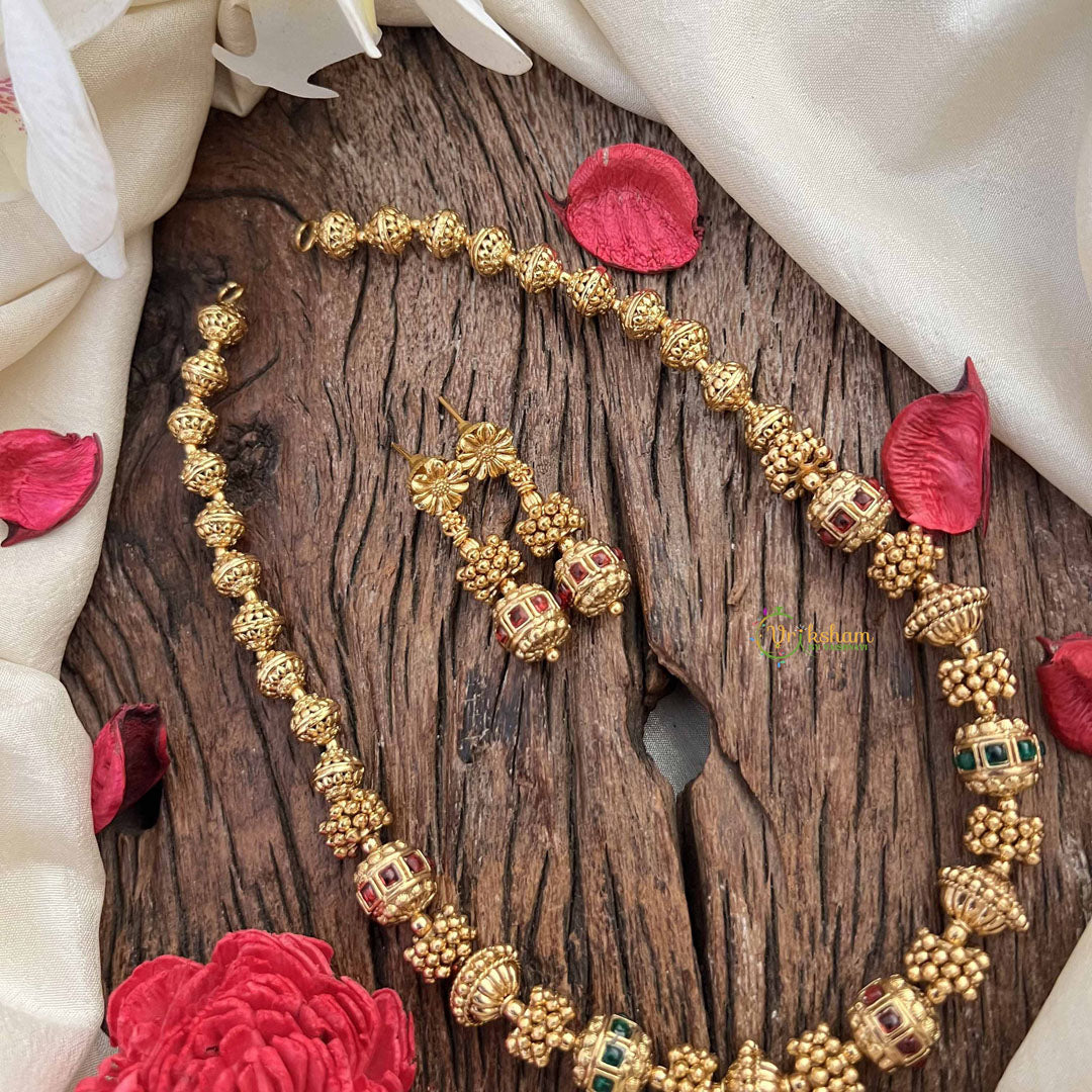 The Vriksham Rajwada Gold Charm Beaded Neckpiece captures the essence of regal heritage with its exquisite gold-toned beads and intricate craftsmanship. This elegant piece lends a sophisticated royal charm, perfect for elevating traditional attire with subtle luxury and timeless style.